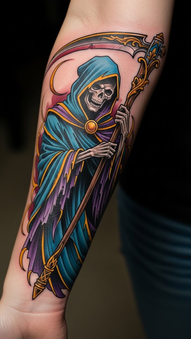 The Grim Reaper serves as a poignant reminder to cherish life and embrace change, making it a deeply personal and meaningful piece of body art.