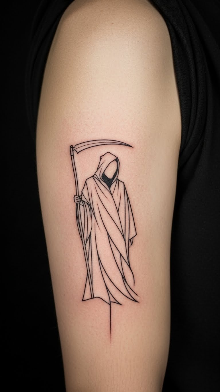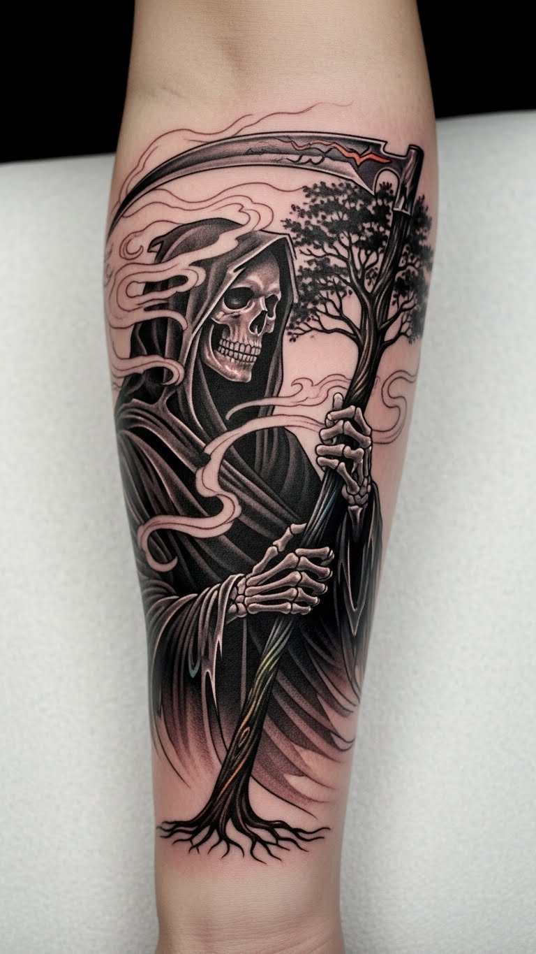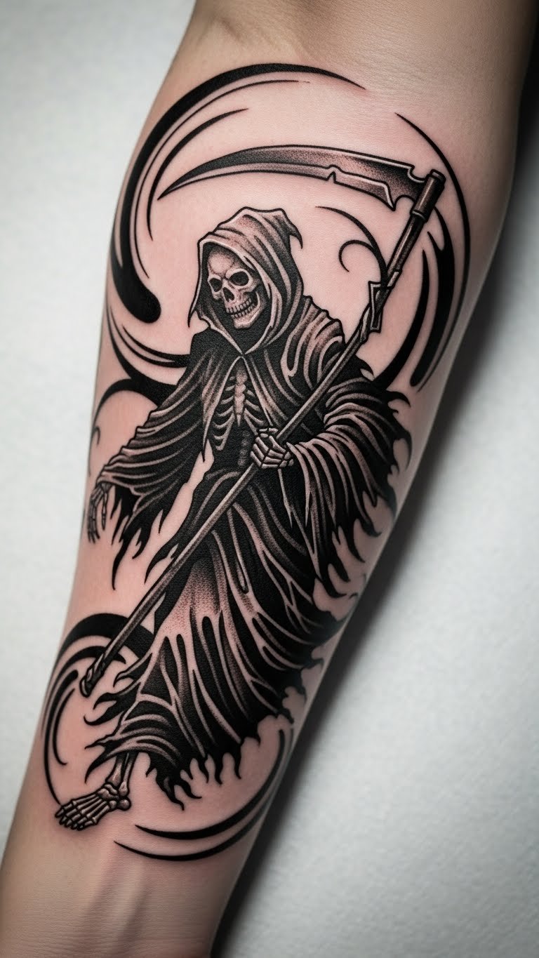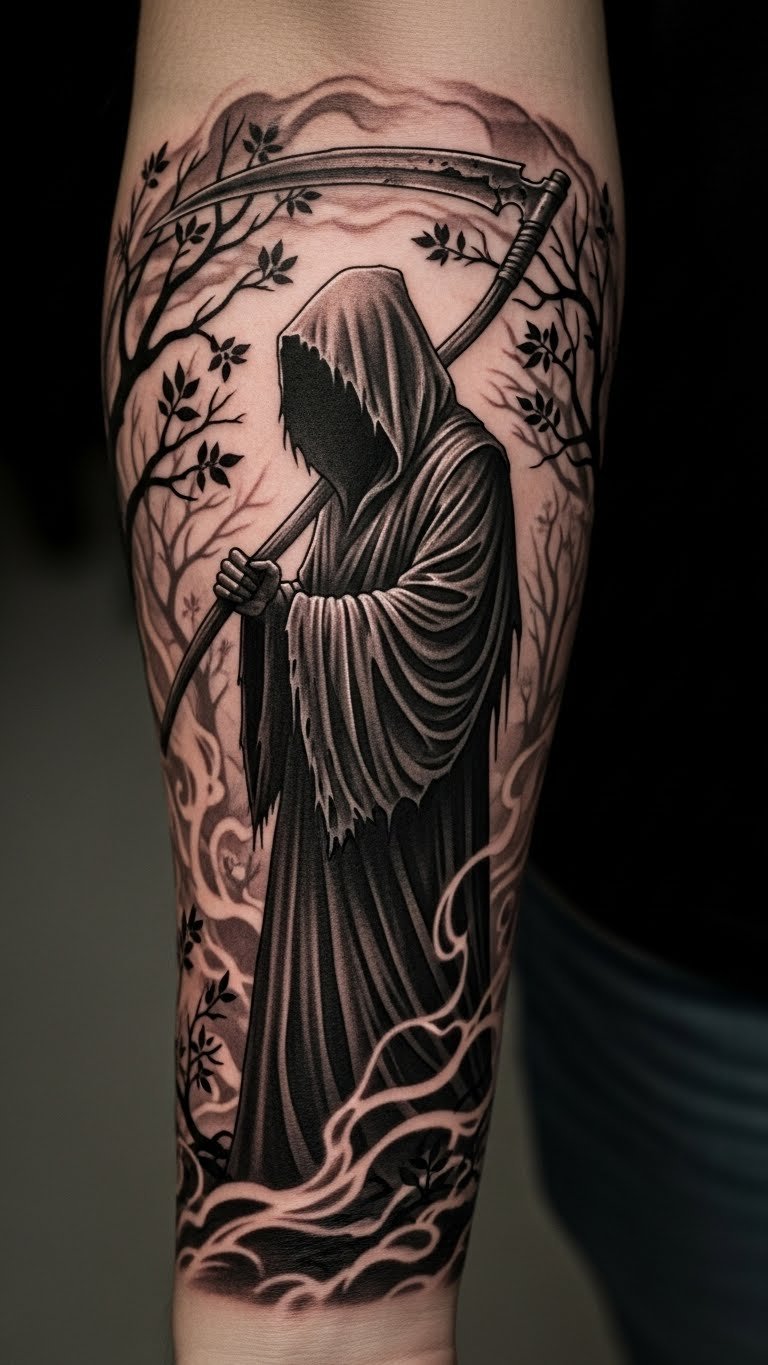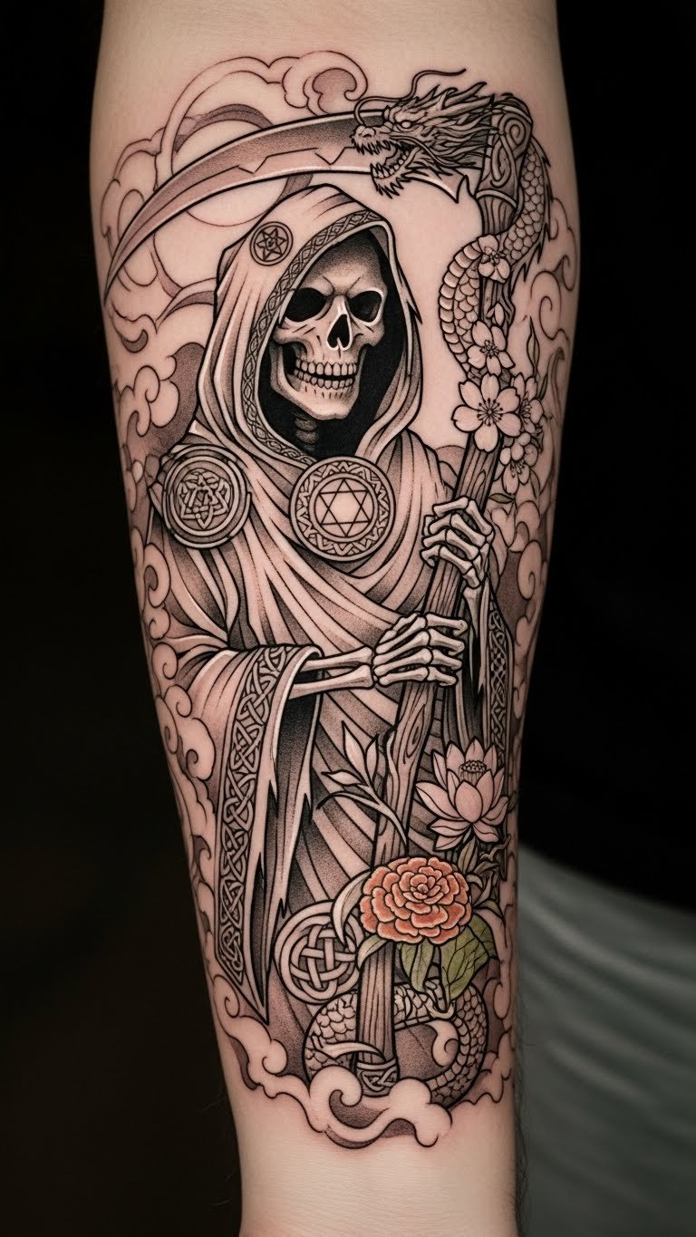 This tattoo design symbolizes the interconnectedness of life and death, merging various cultural interpretations of the Grim Reaper into a single, powerful image.