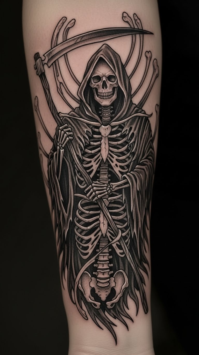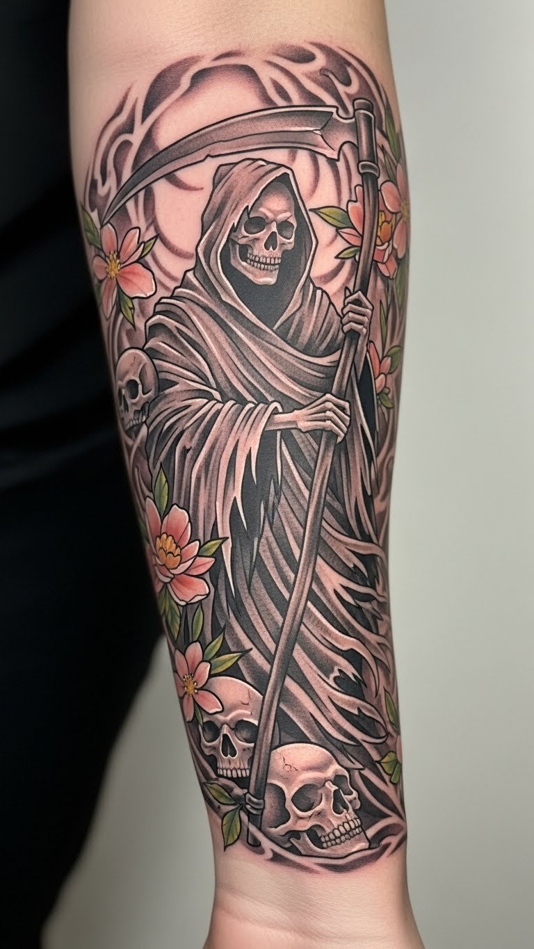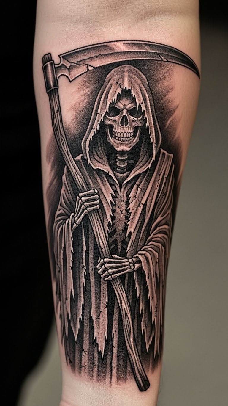 The Grim Reaper tattoo on the forearm serves as a powerful reminder of life’s fragility, with the skeleton elements reinforcing the theme of mortality.