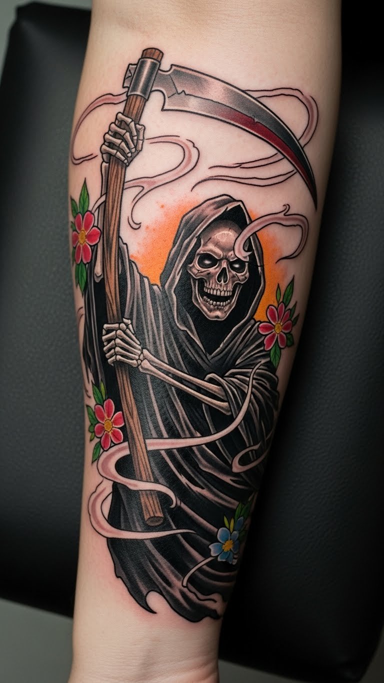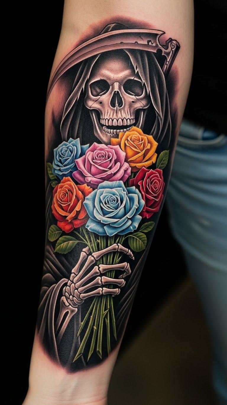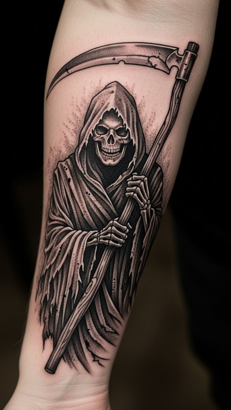 The Grim Reaper tattoo on the forearm serves as a powerful reminder of life’s fragility, with the skeleton elements reinforcing the theme of mortality.