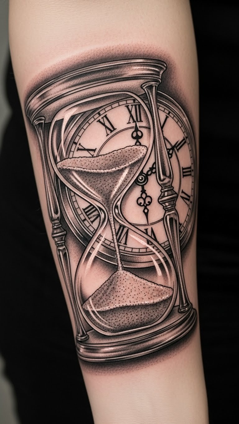This tattoo symbolizes the inevitability of mortality and the passage of time, serving as a reminder of life’s fragility.