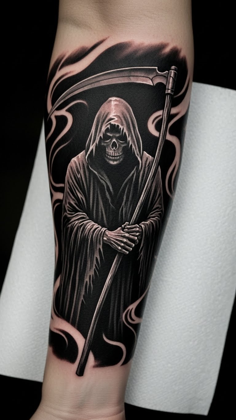 The Grim Reaper tattoo on the forearm symbolizes the acceptance of mortality and the balance between life and death. Its prominent placement allows for personal reflection, serving as a daily reminder of life’s transient nature and the beauty within it. The intricate details evoke deep emotions, inviting onlookers to contemplate their own journeys while celebrating the artistry and meaning behind this powerful symbol.