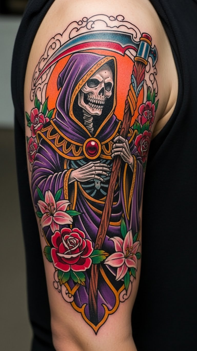 This tattoo embodies the defiance against mortality, illustrating the Grim Reaper not as a figure of fear but as a powerful symbol of resilience and strength.