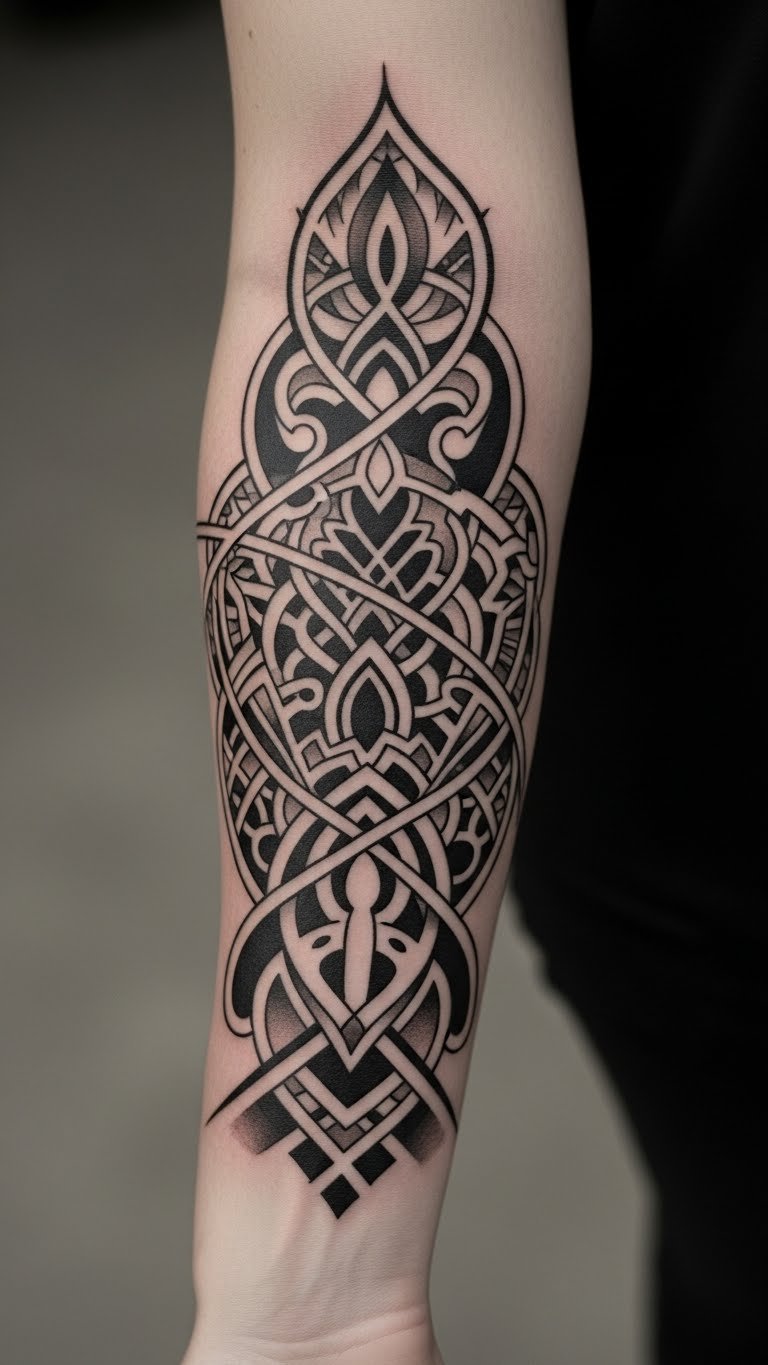 The abstract elements encourage individual interpretation, making it a deeply personal expression that resonates with the wearer’s journey through life’s complexities.