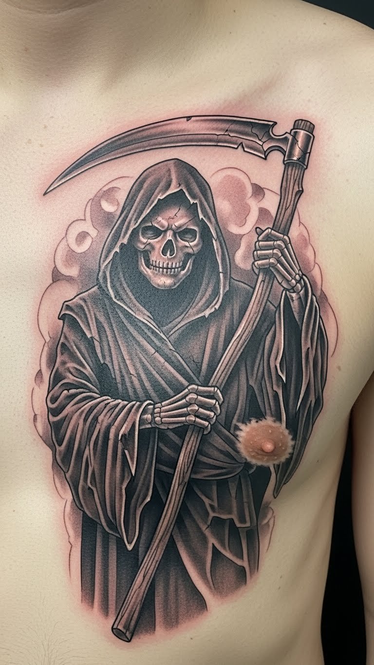 This Grim Reaper tattoo serves as a poignant reminder of mortality and the inevitability of life’s end.