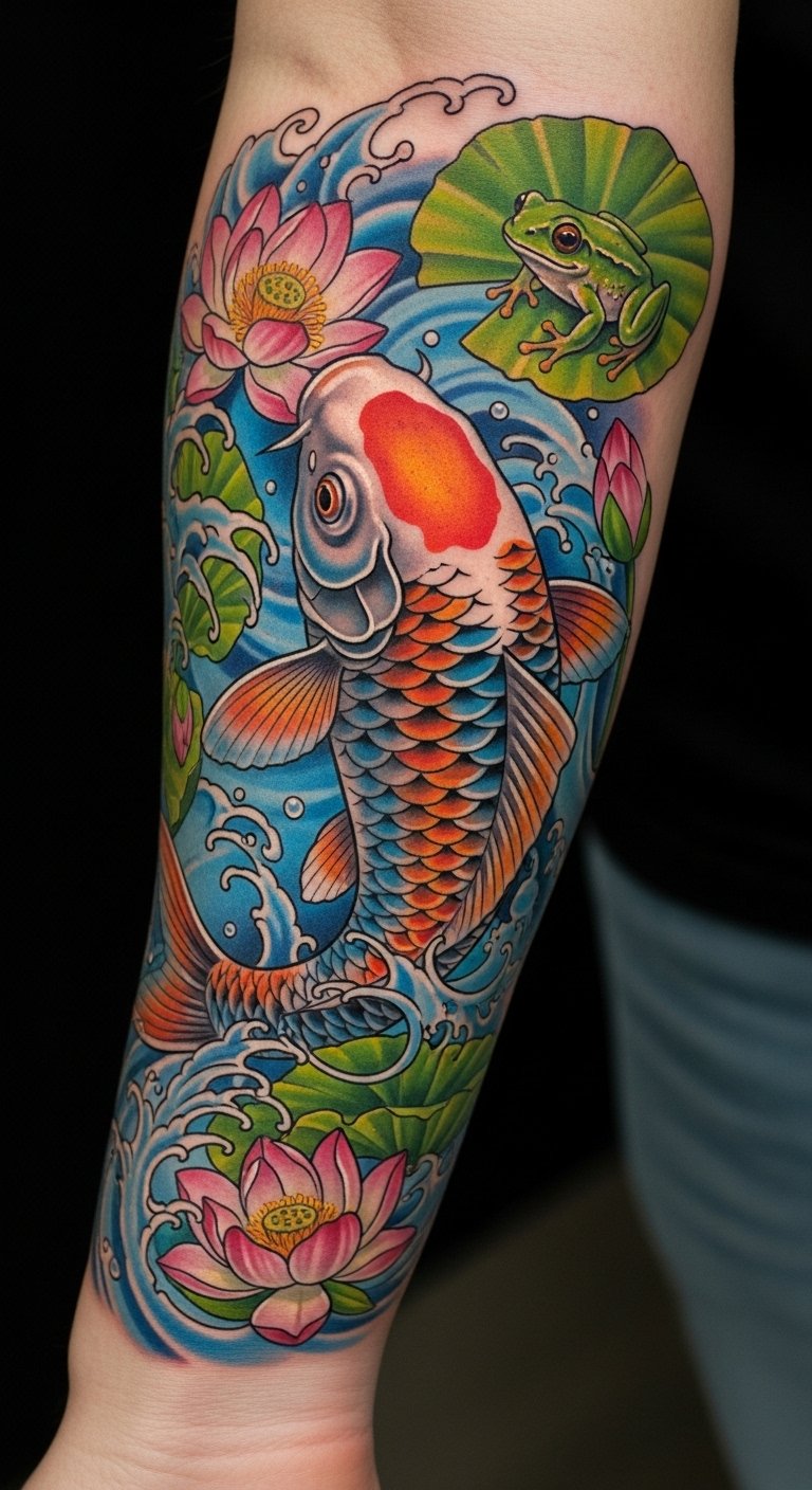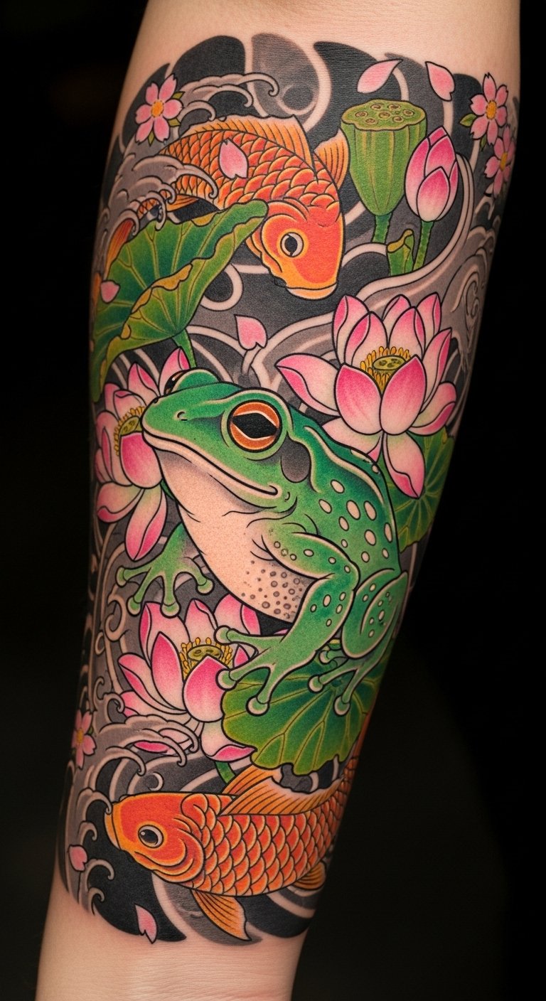 The tattoo illustrates the powerful symbolism of koi fish and frogs in Japanese art, representing perseverance, courage, transformation, renewal, and luck.
