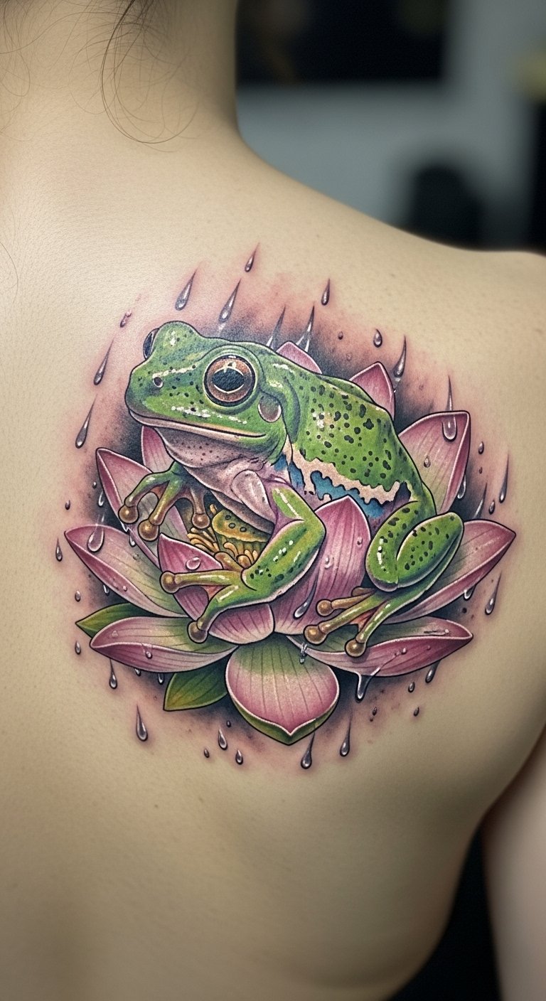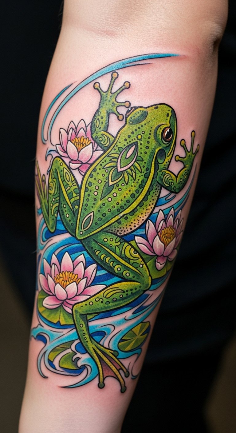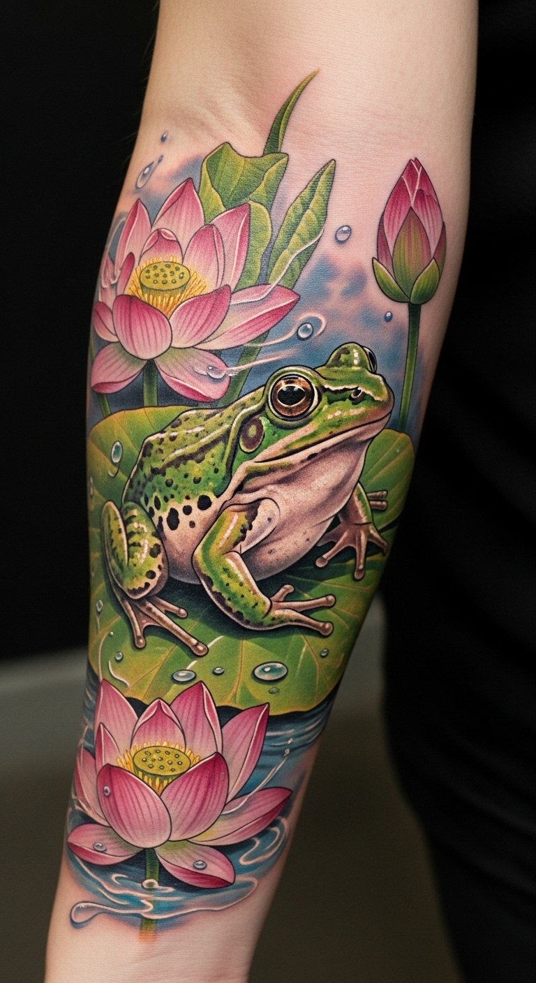 The enchanting combination of frogs and lotus flowers in tattoo artistry creates a powerful visual narrative that speaks to both resilience and spiritual growth.
