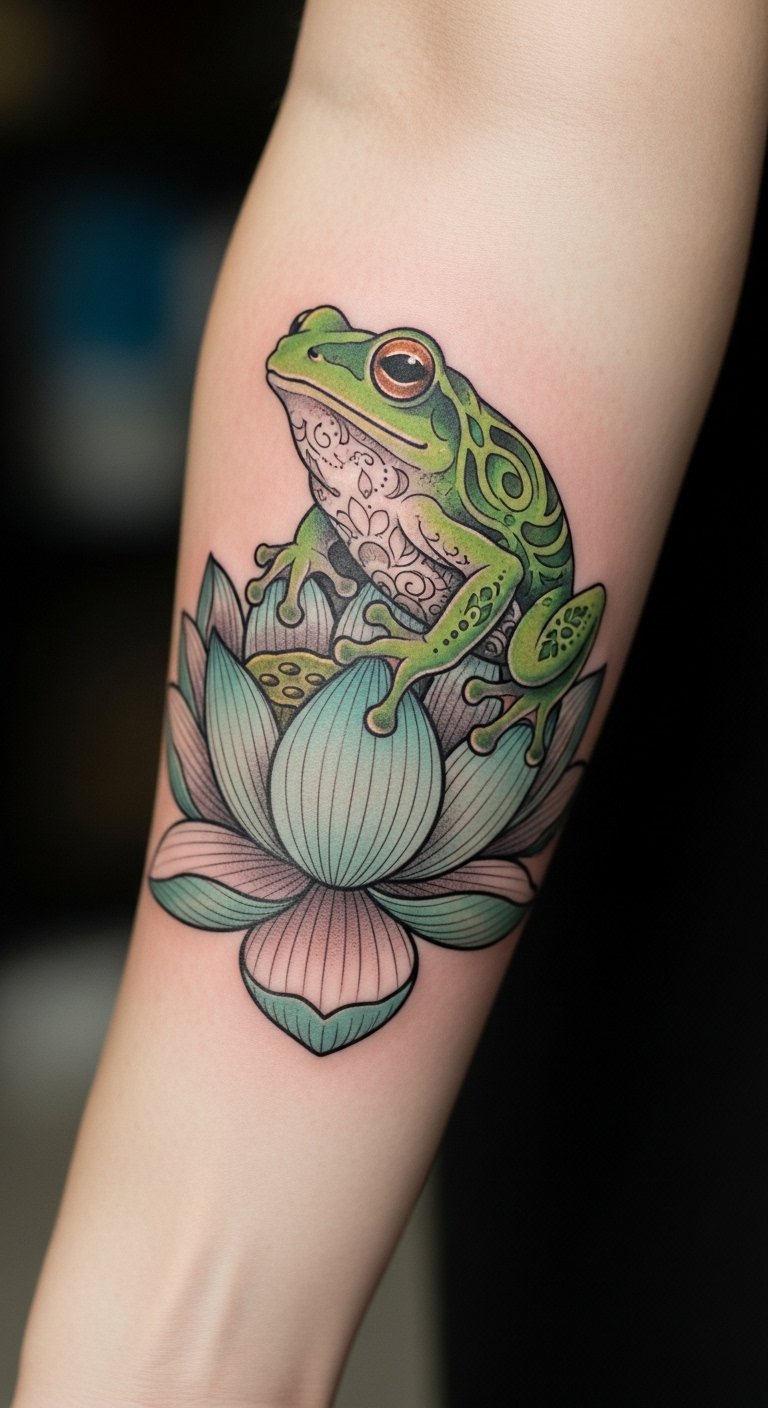 This tattoo symbolizes transformation and prosperity, embodying the journey of personal growth and spiritual awakening. Placed on the forearm, it serves as a constant reminder of the wearer’s connection to nature and the importance of embracing change. The lotus flower represents purity and enlightenment, while the frog’s presence signifies adaptability and resilience. Together, they create a meaningful narrative that resonates deeply with the individual’s life experiences and aspirations.
