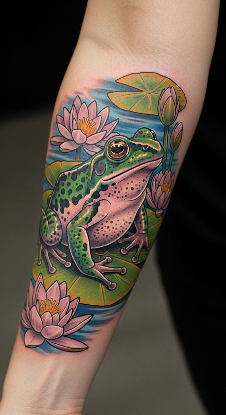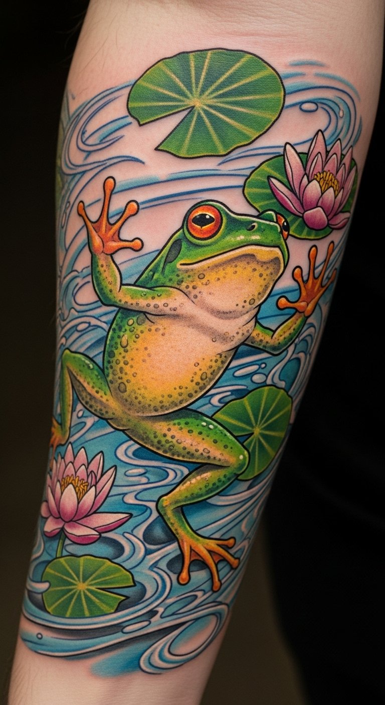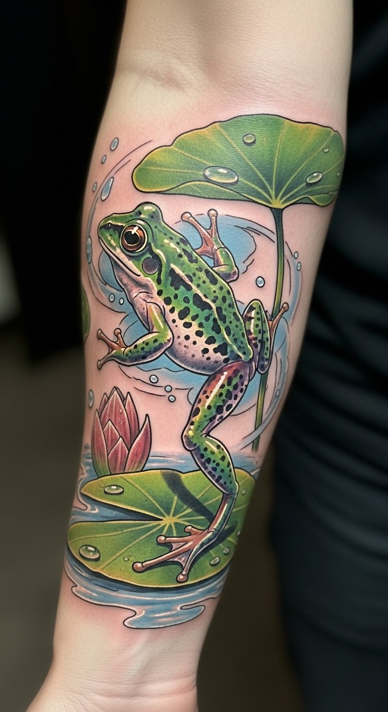Positioned on the forearm, it serves as a visible reminder of resilience and the beauty found in embracing new beginnings. The image of the frog mid-leap captures the essence of taking bold steps into the unknown, while the surrounding water lilies represent serenity and the beauty of nature’s cycles.