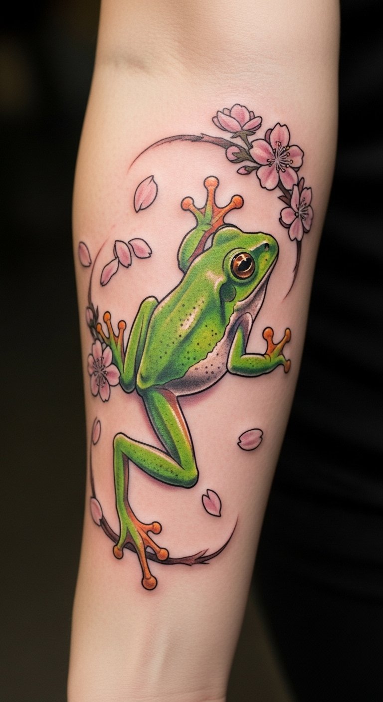 The frog’s placement on the forearm serves as a constant reminder of resilience and the beauty of transformation in life’s journey.