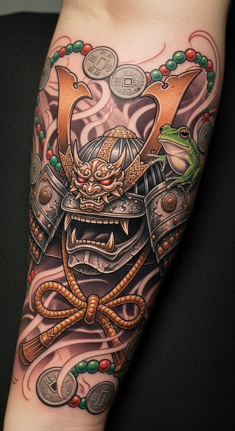 This striking forearm tattoo integrates the fierce protection of the samurai helmet with the symbolism of wealth represented by the coins, complemented by the playful imagery of a frog.