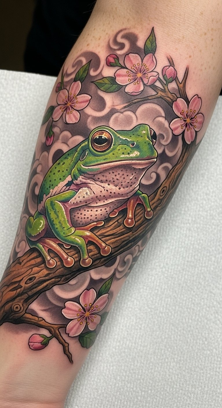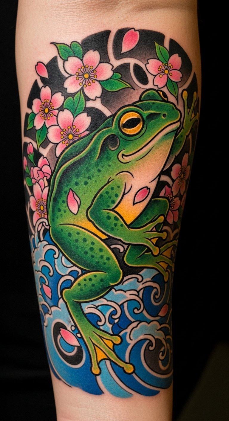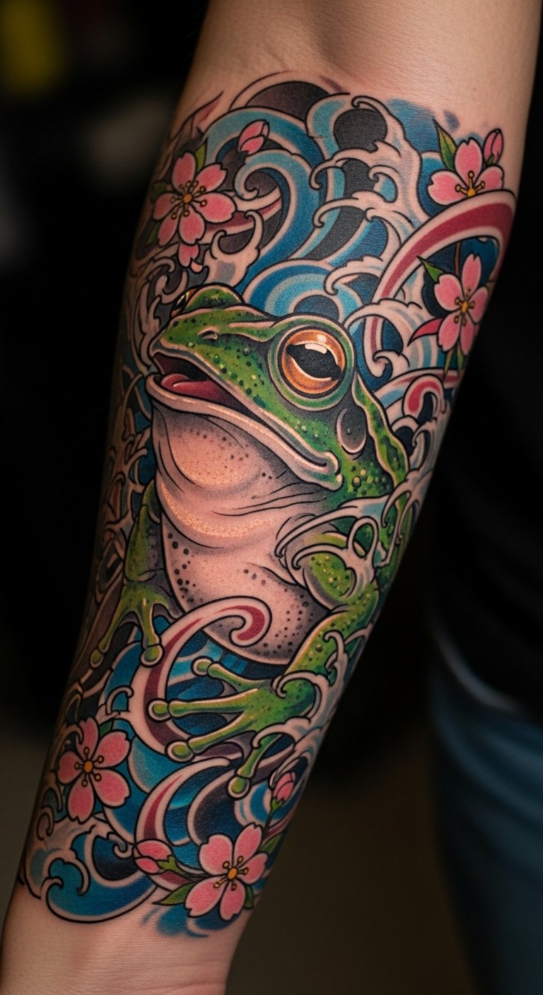 This tattoo symbolizes transformation and renewal, embodying the essence of frog healing in Japanese culture.