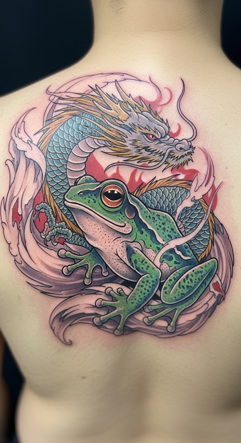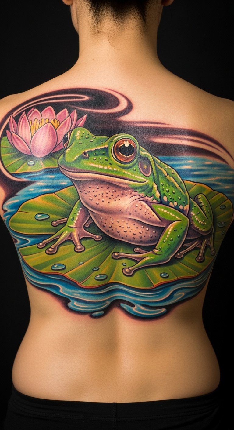 This large scale frog tattoo symbolizes luck and transformation, embodying the journey of personal growth in vibrant detail.
