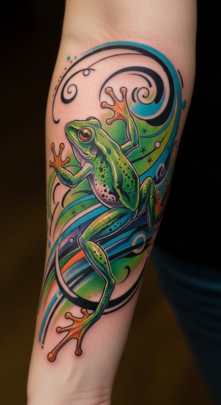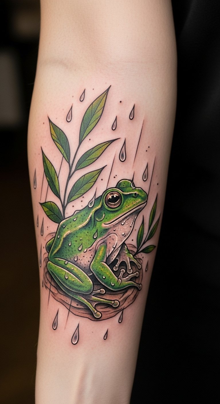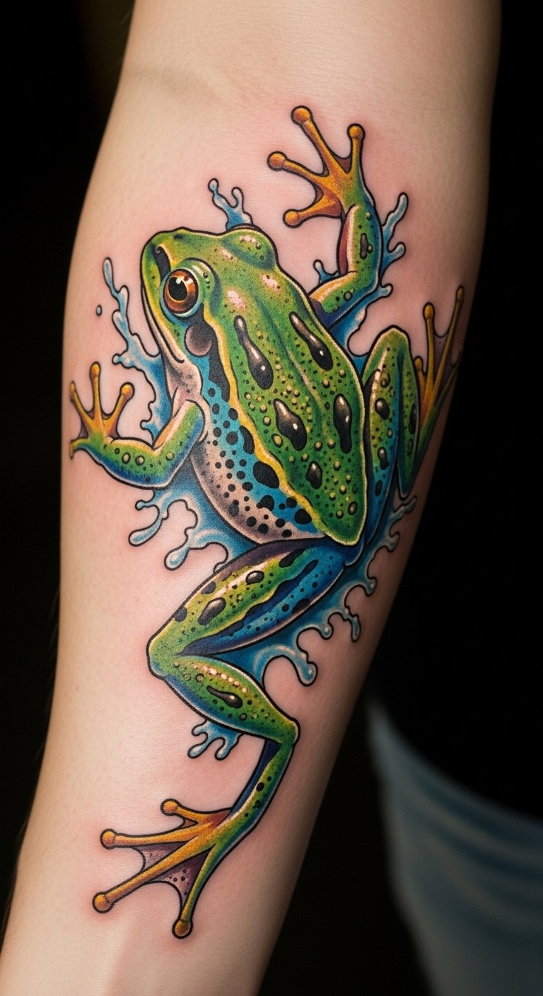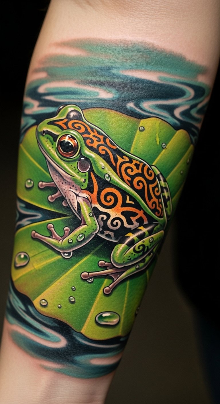 This tattoo symbolizes resilience and transformation, embodying the spirit of the frog as a creature that thrives in various environments.