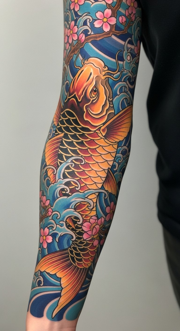 The koi fish adds an element of perseverance and strength, embodying the journey of overcoming challenges.