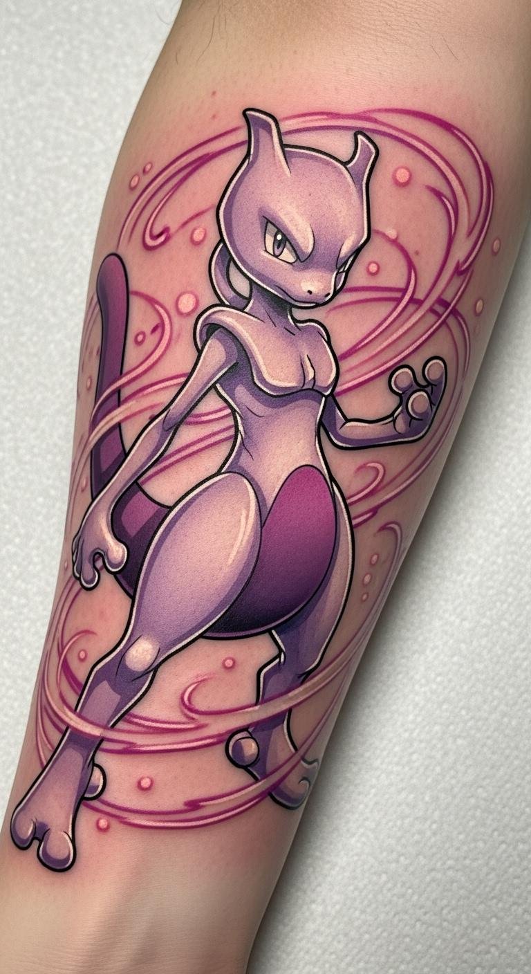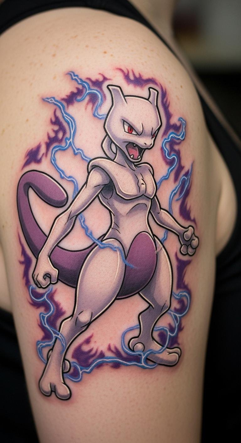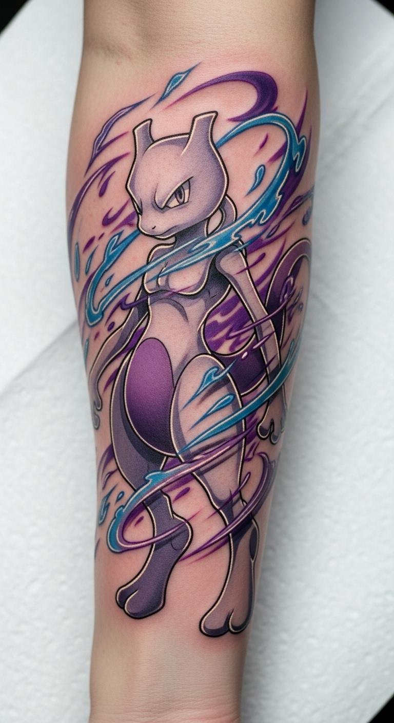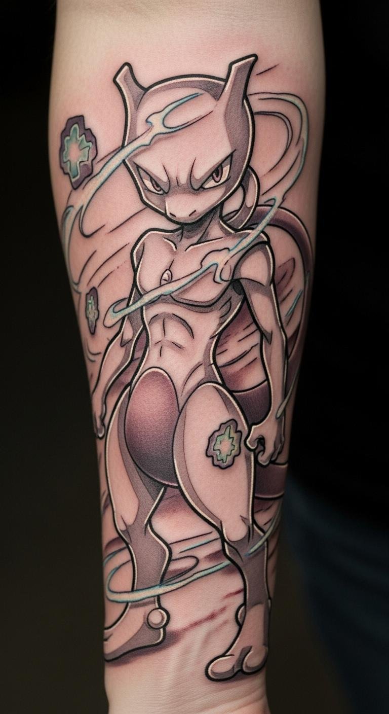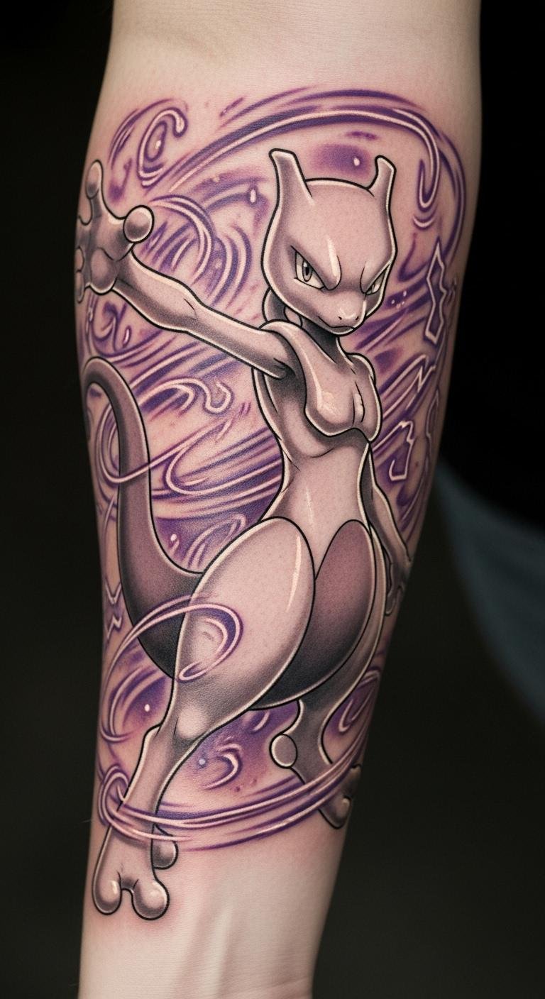 This tattoo symbolizes the internal struggles and resilience that Mewtwo represents, reflecting themes of creation and identity.