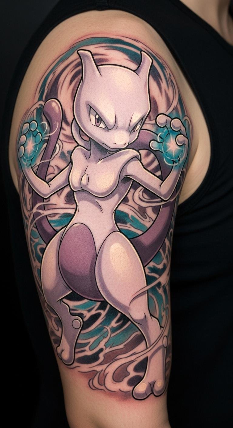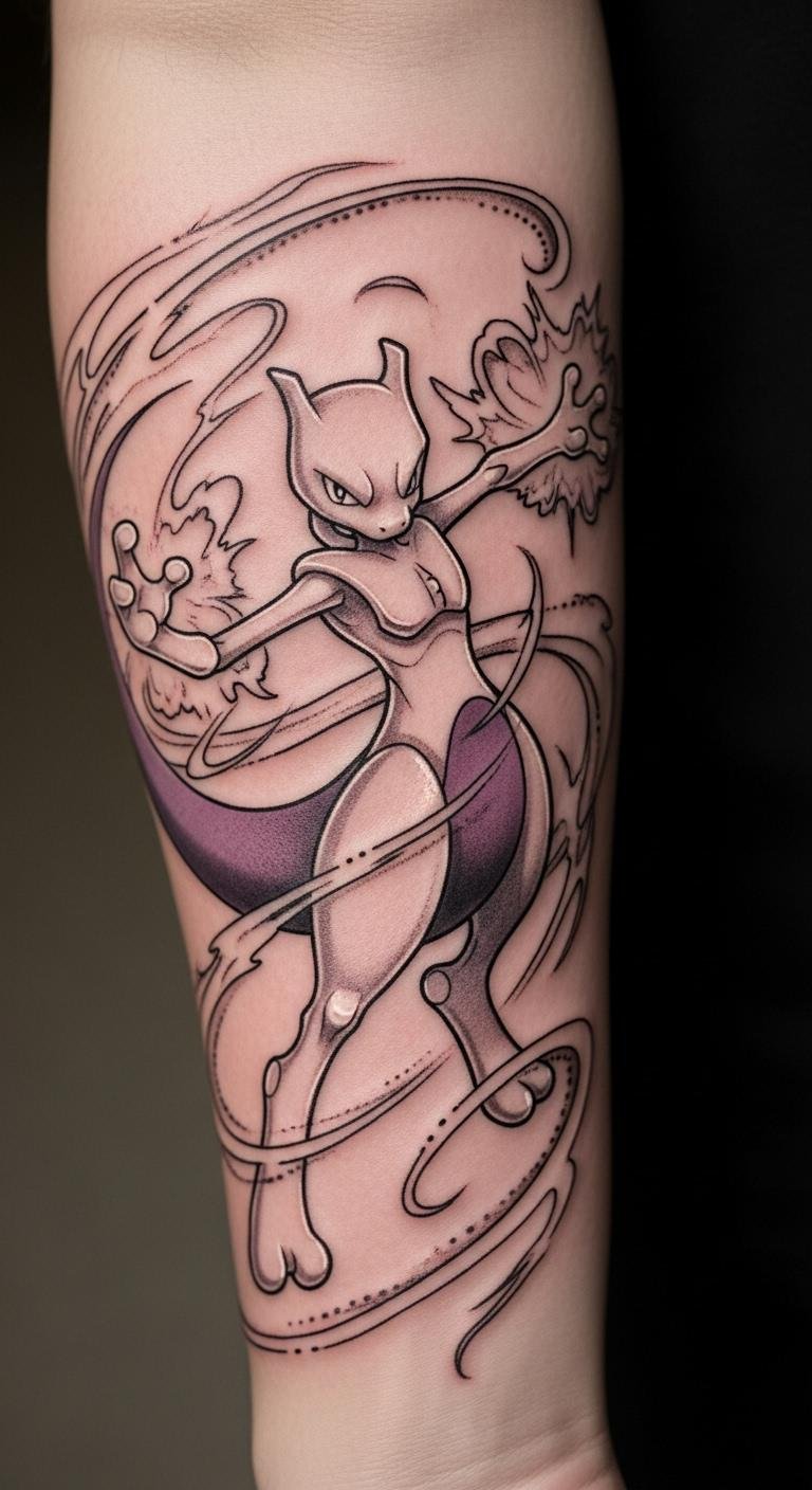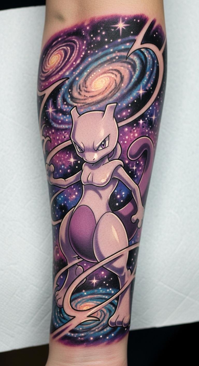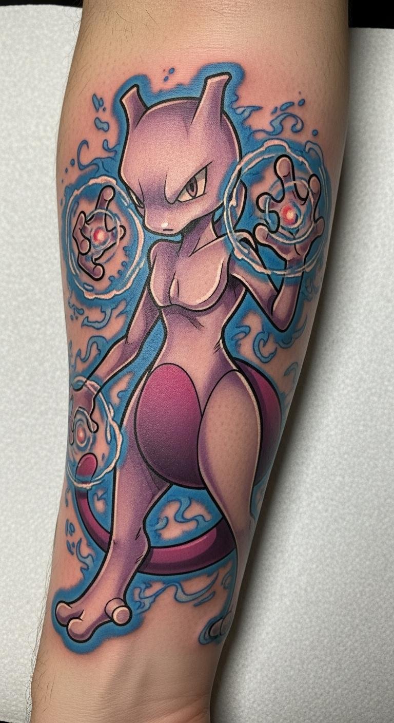 This tattoo symbolizes the internal struggles and resilience that Mewtwo represents, reflecting themes of creation and identity.