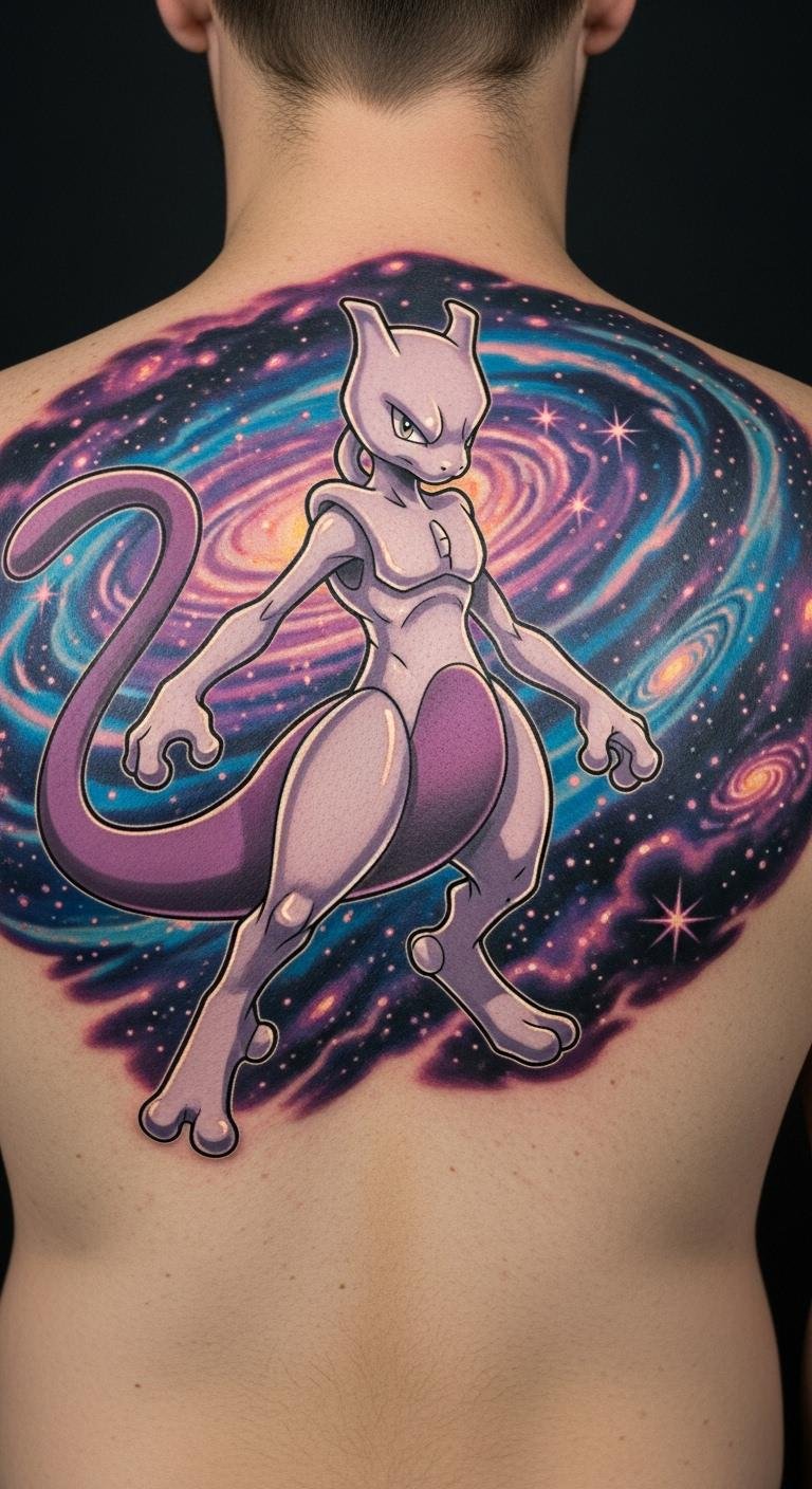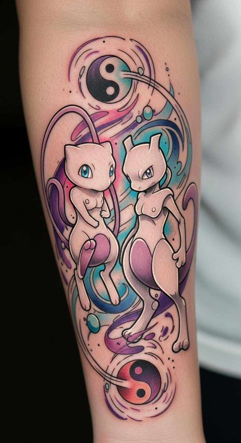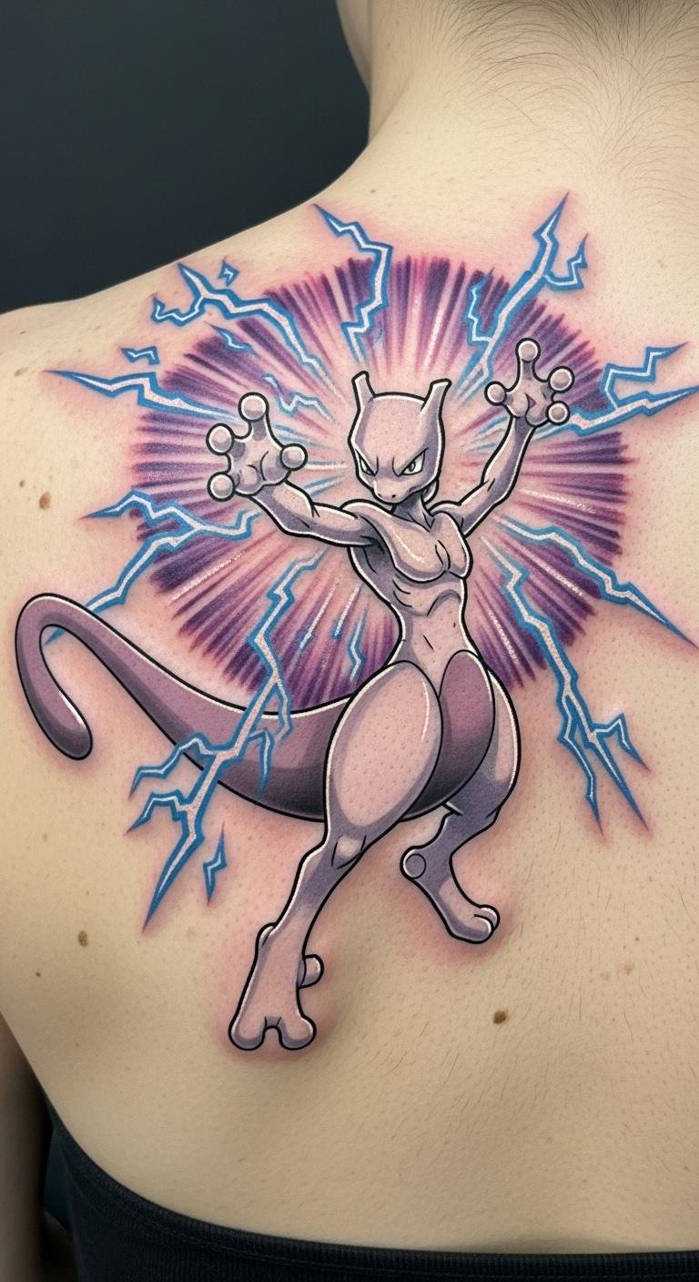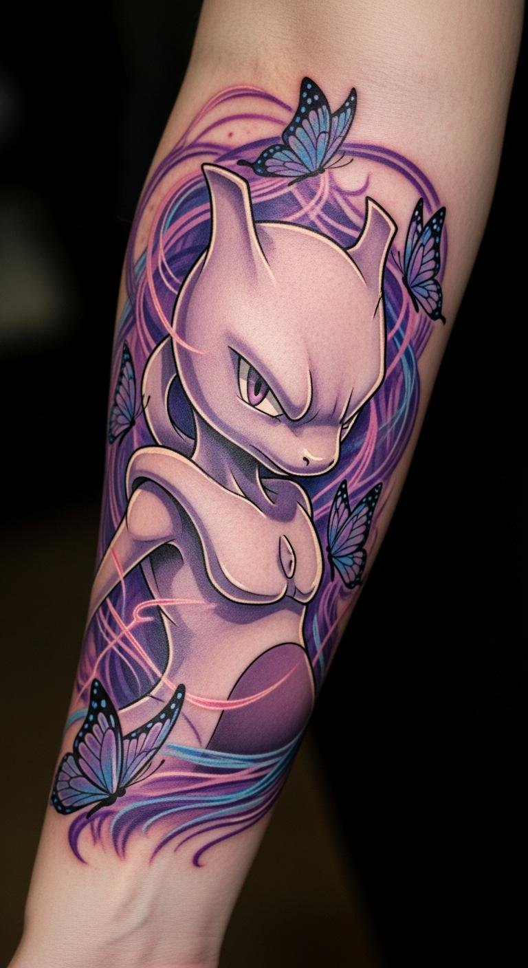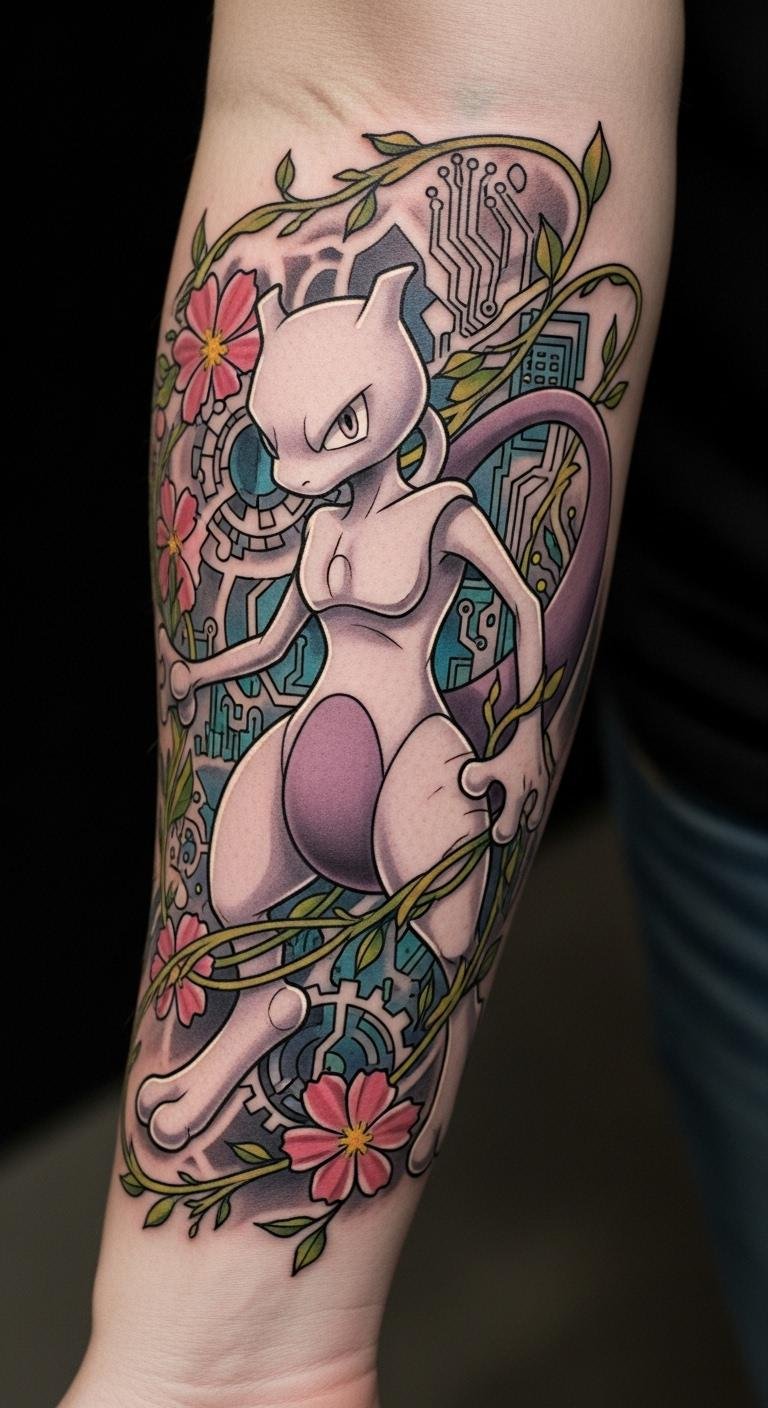 This tattoo symbolizes the internal struggles and resilience that Mewtwo represents, reflecting themes of creation and identity.