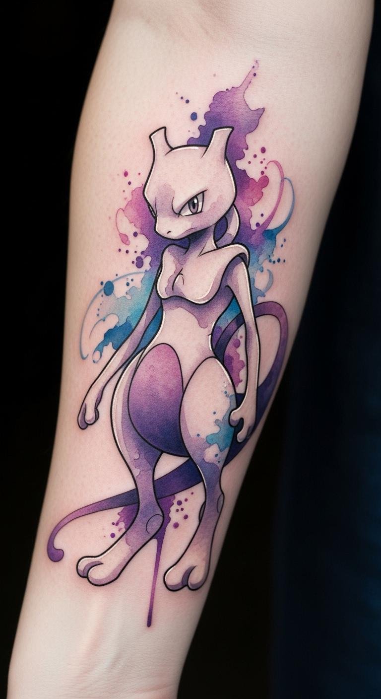 The ethereal watercolor design symbolizes the balance between creation and manipulation, mirroring the complexity of Mewtwo’s essence. Each time the wearer glances at the tattoo, they’re reminded of their journey, evoking emotions tied to resilience and psychic power, while the flowing colors reflect the beauty in one’s personal evolution.