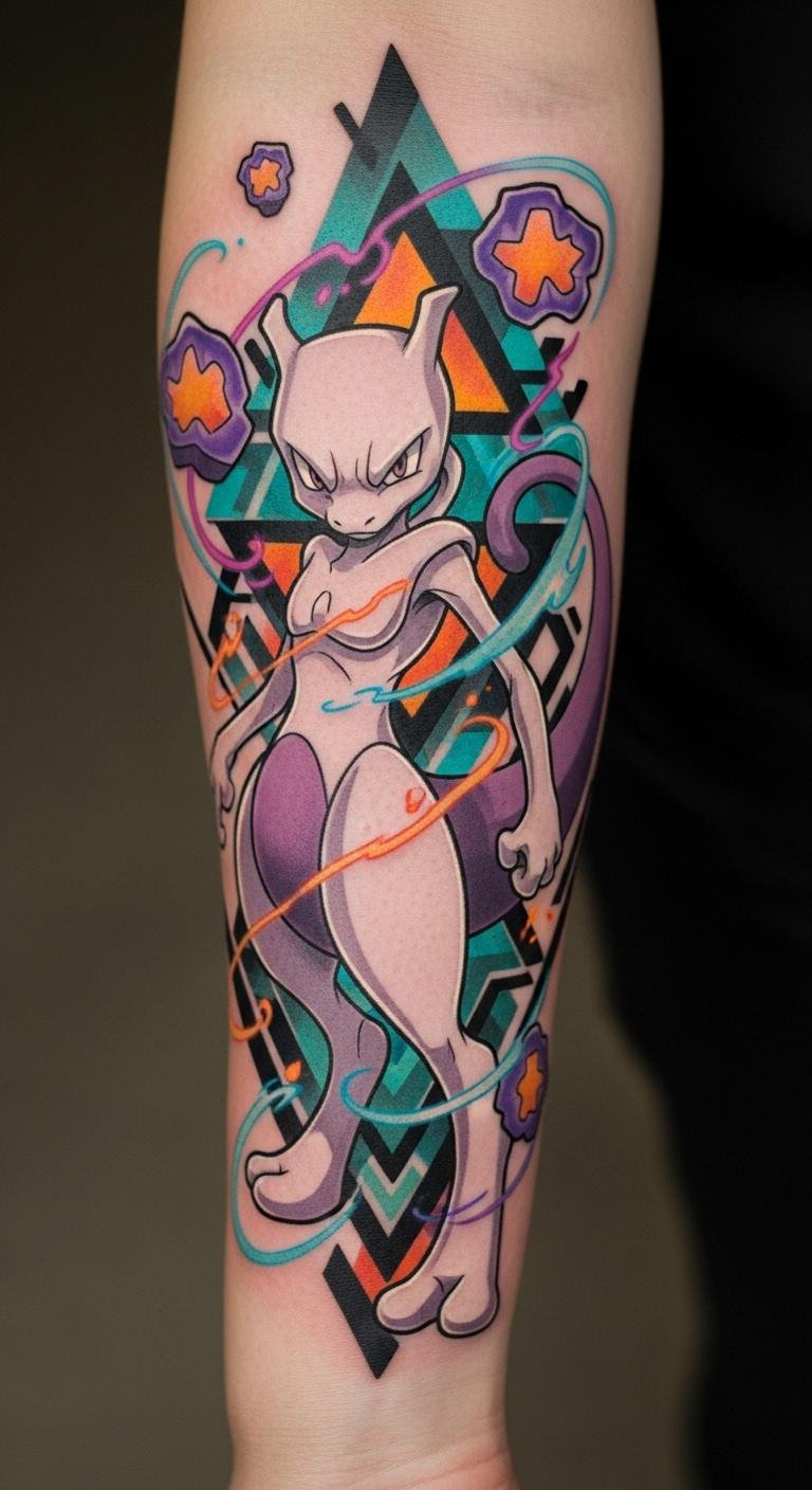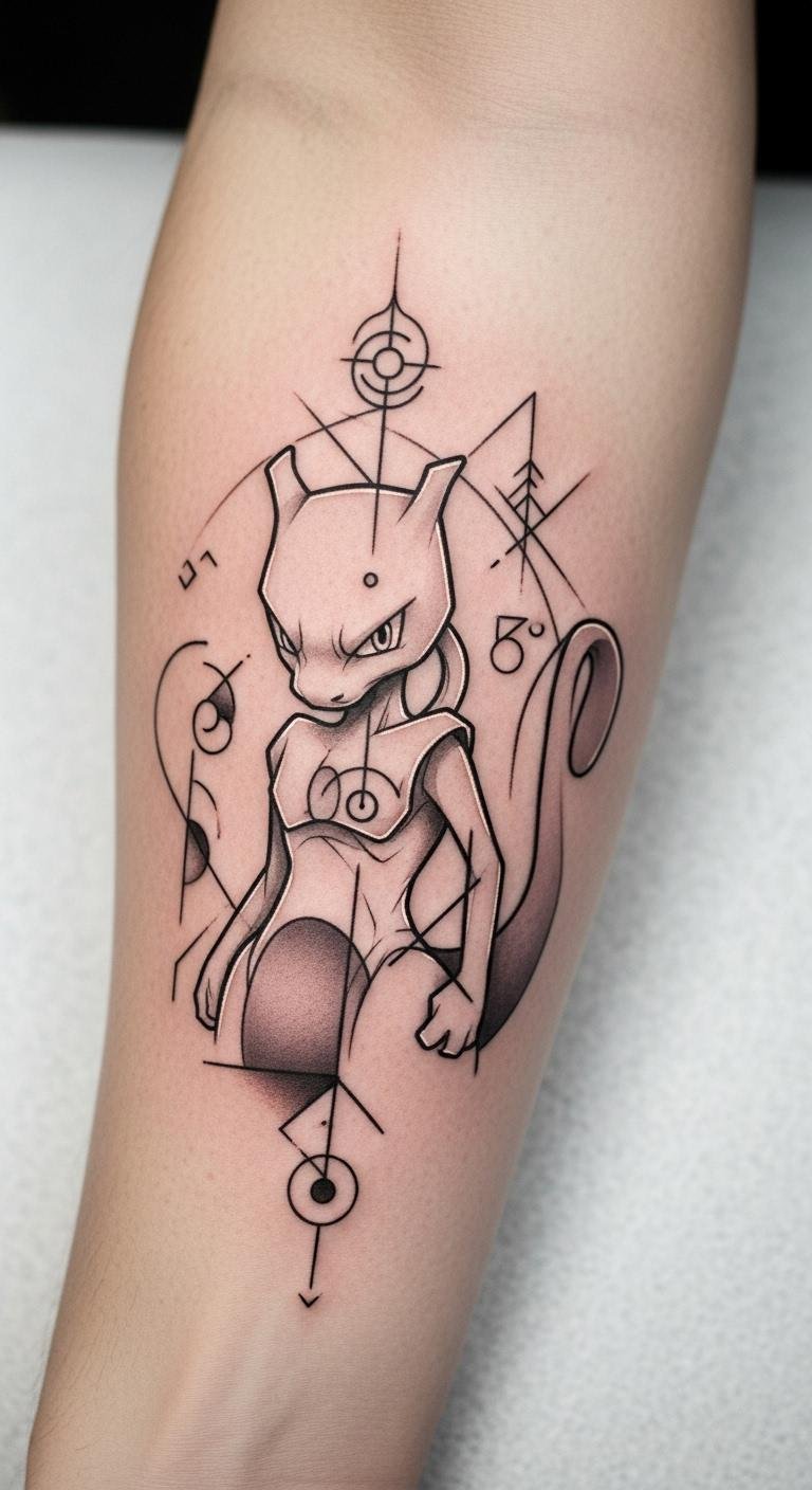 This tattoo design captures the essence of Mewtwo through innovative geometric elements, symbolizing strength and intelligence.