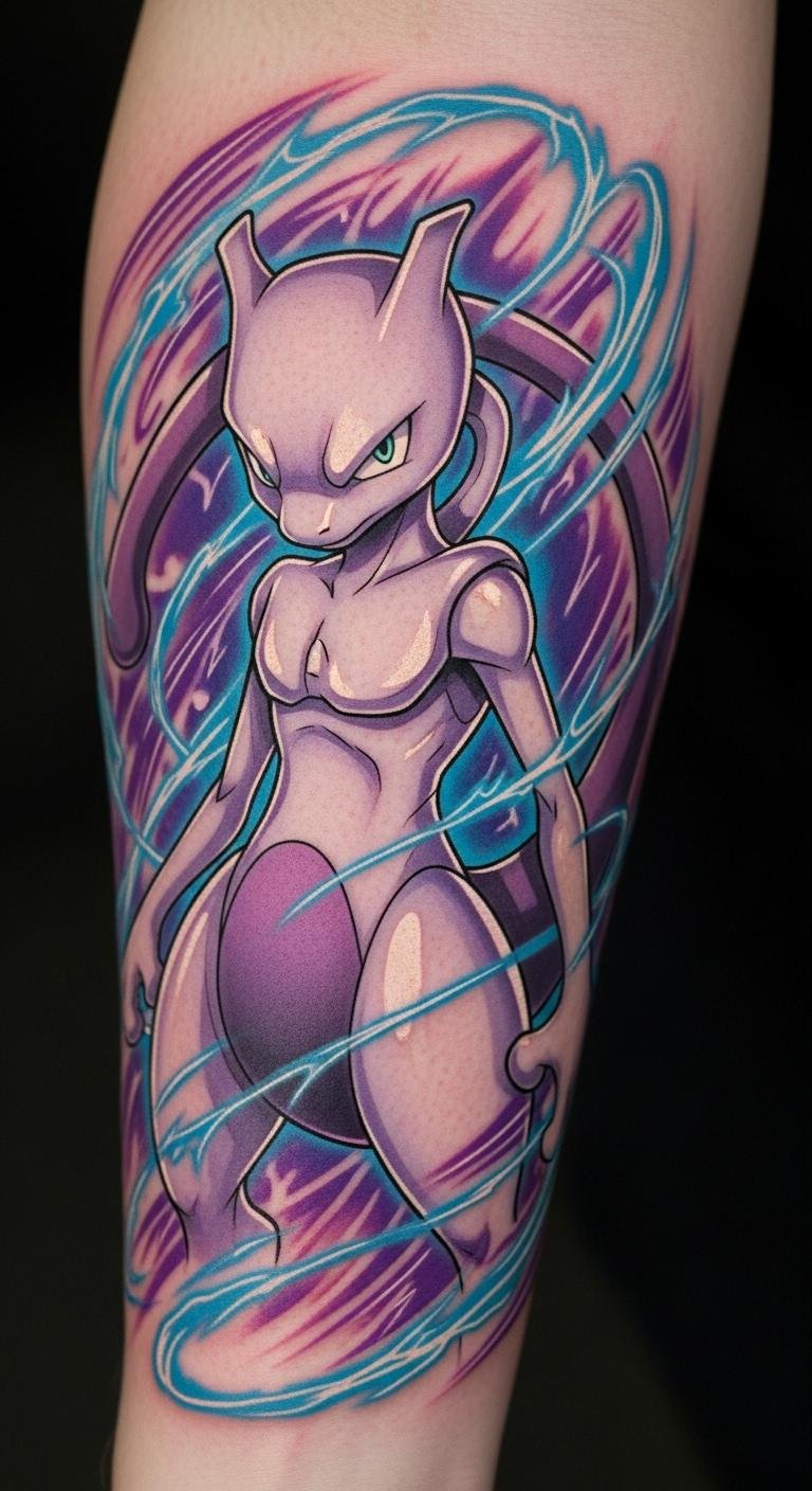 The choice of a vibrant purple for the Mewtwo tattoo symbolizes power and mystery, reflecting the character’s strength and enigmatic nature.