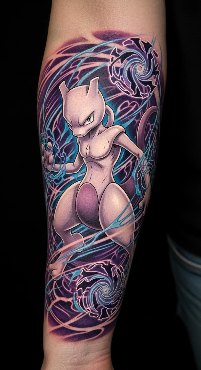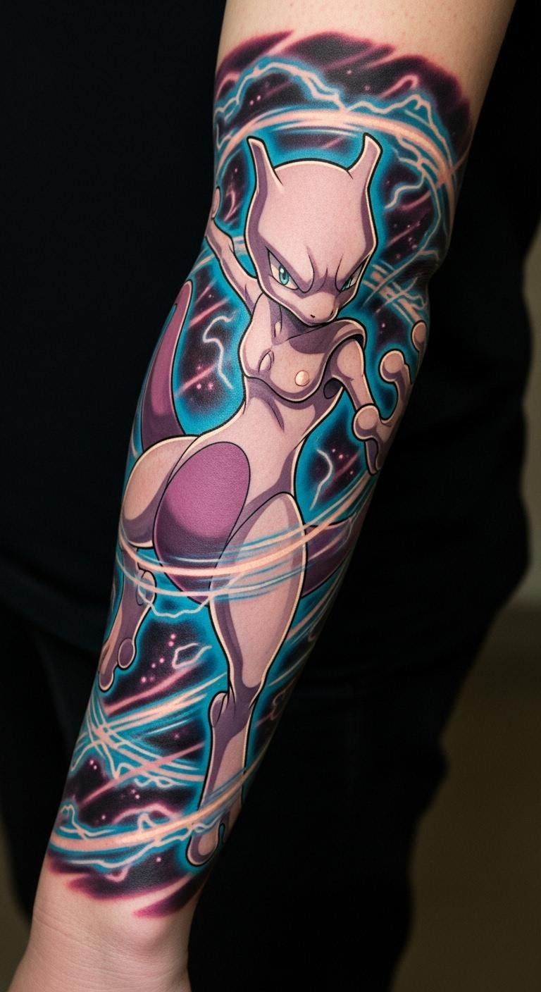 Dynamic Arm Tattoos: Mewtwo’s Energy on Display
