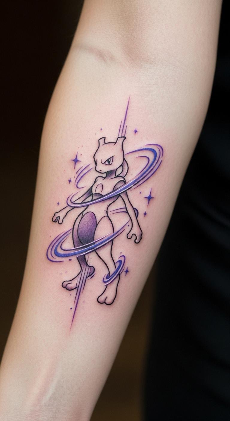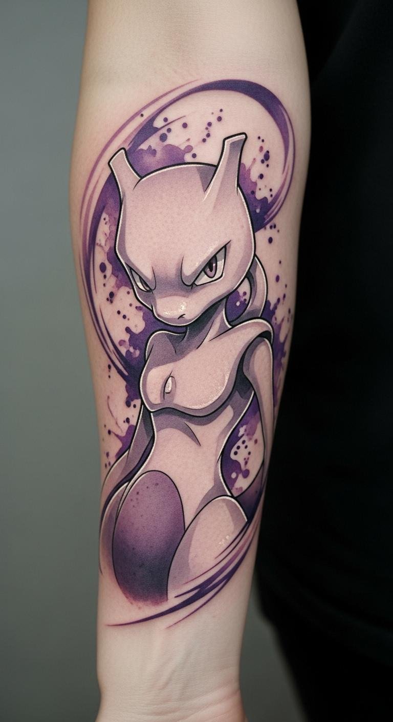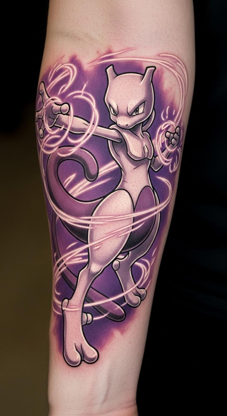 This Mewtwo tattoo is placed on the forearm, a visible area that invites conversation and introspection.