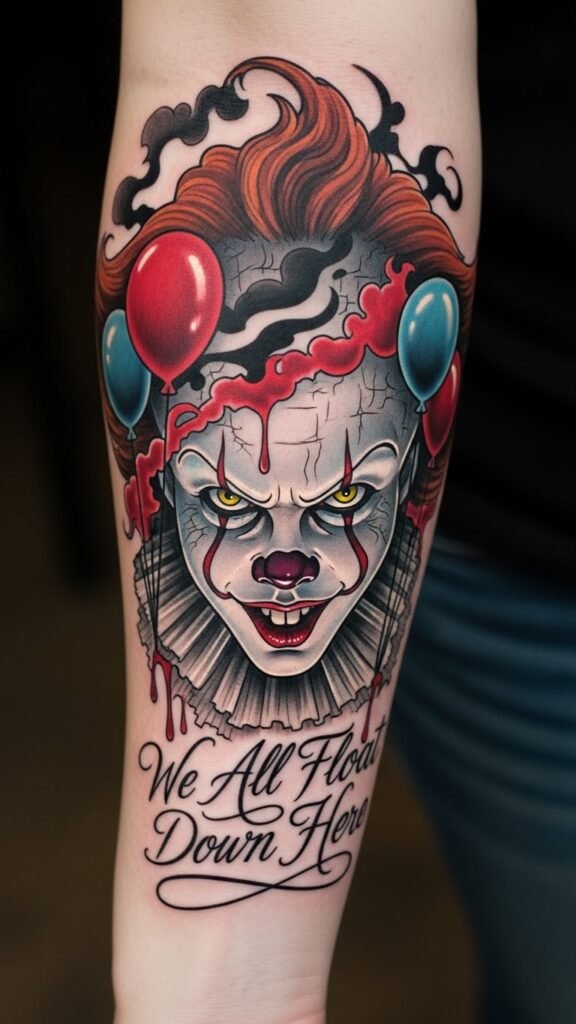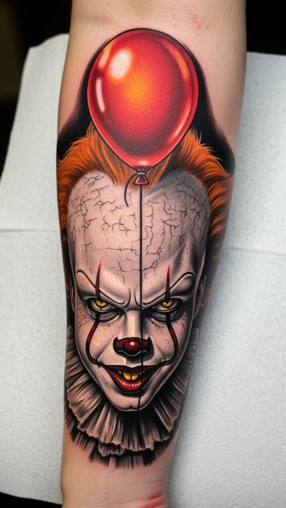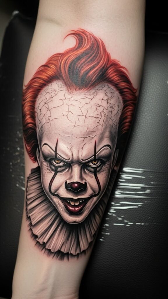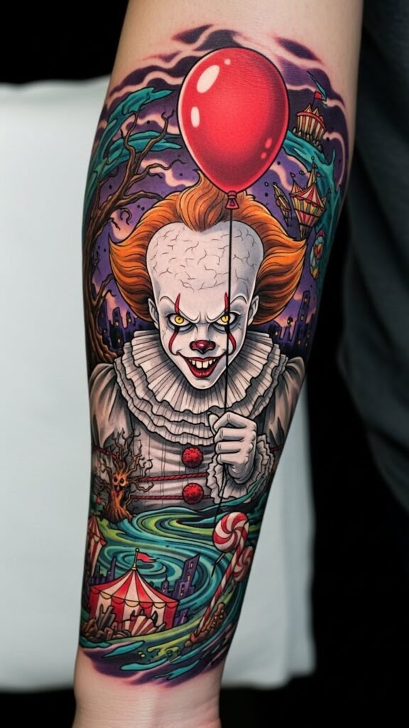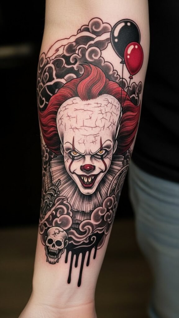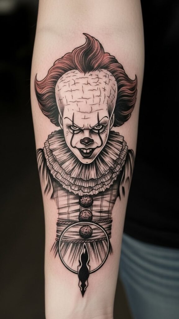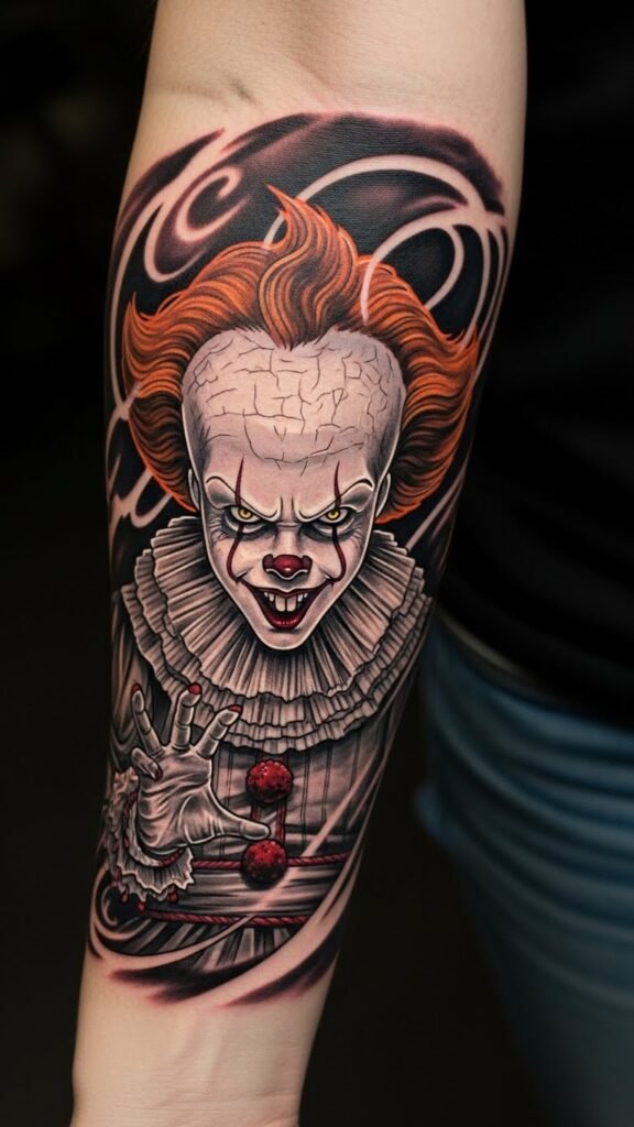 This Pennywise tattoo, placed on the forearm, serves as a powerful symbol of confronting childhood fears.