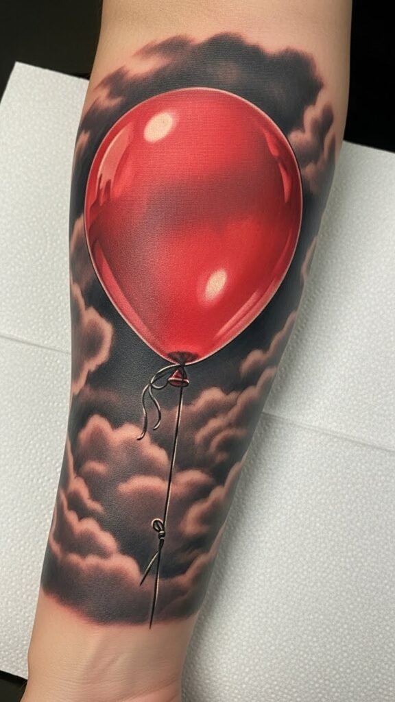 Positioned on the forearm, it becomes a statement piece that invites conversation and reflection. The red balloon serves as a reminder of the playful yet perilous aspects of life, embodying an adventurous spirit while challenging the viewer to confront their own fears.