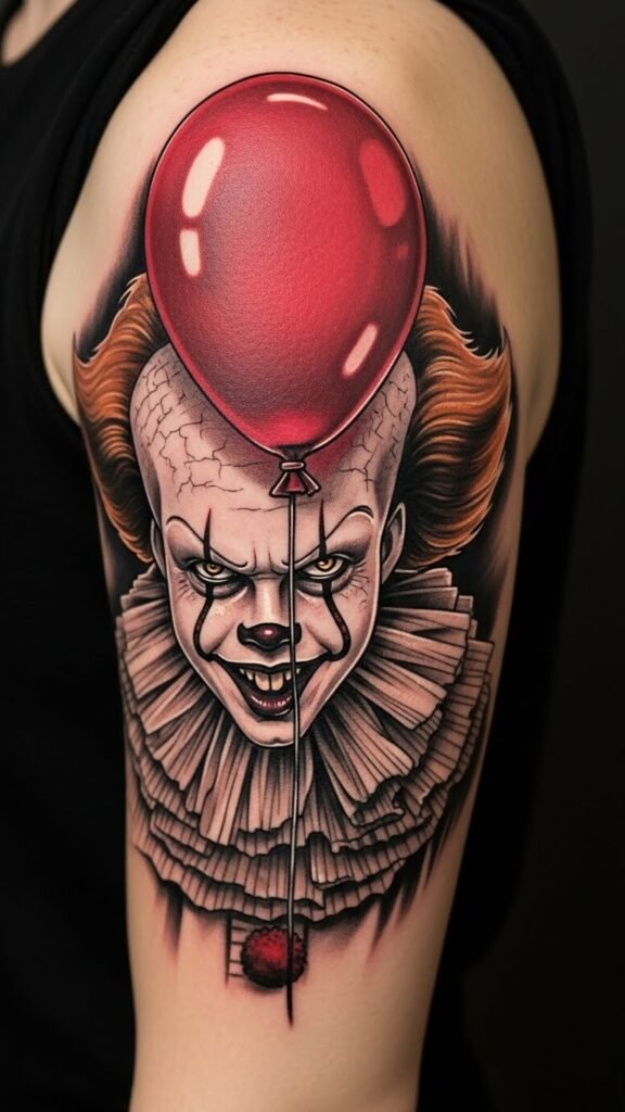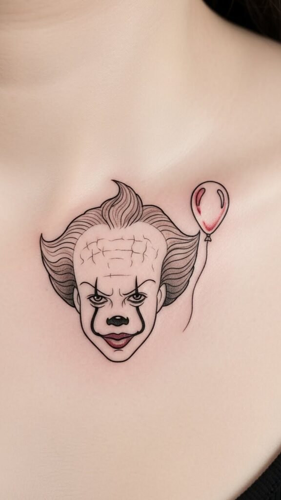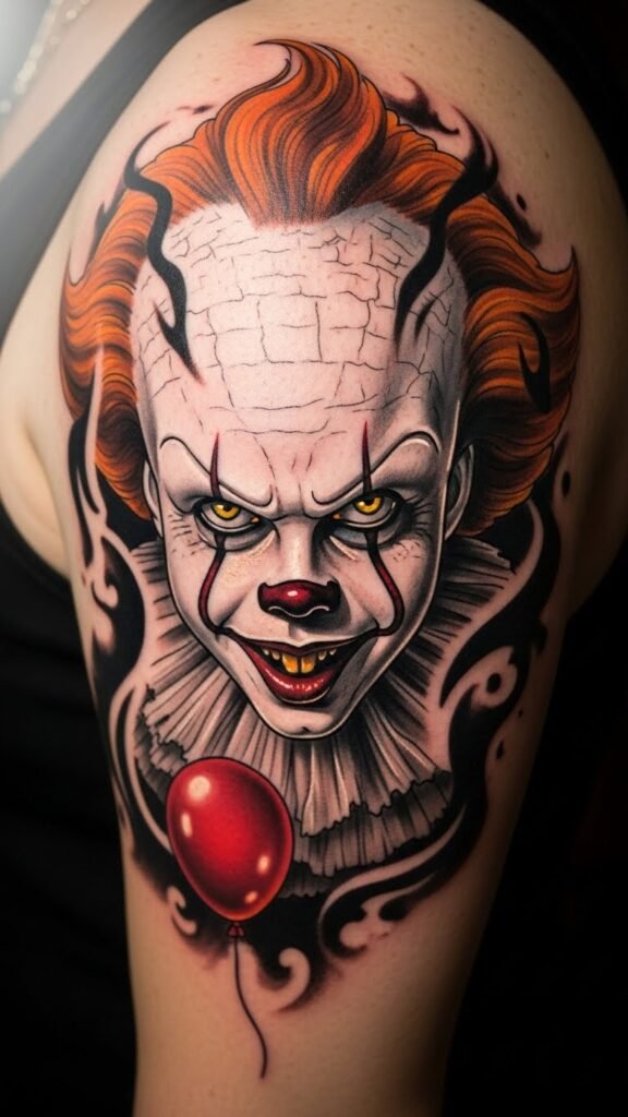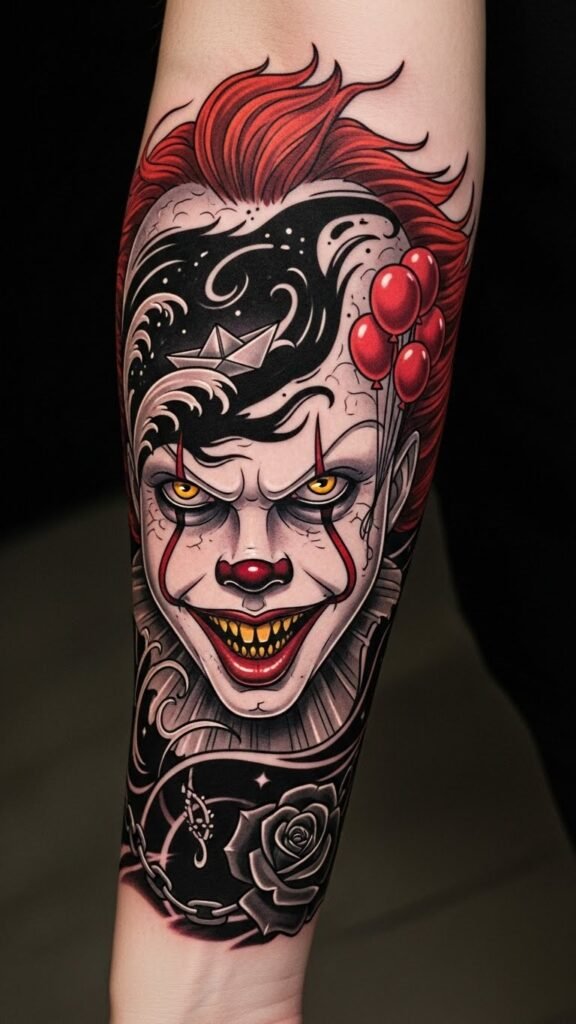 This tattoo concept symbolizes the duality of fear and allure that Pennywise represents, drawing fans into the complex world of horror.