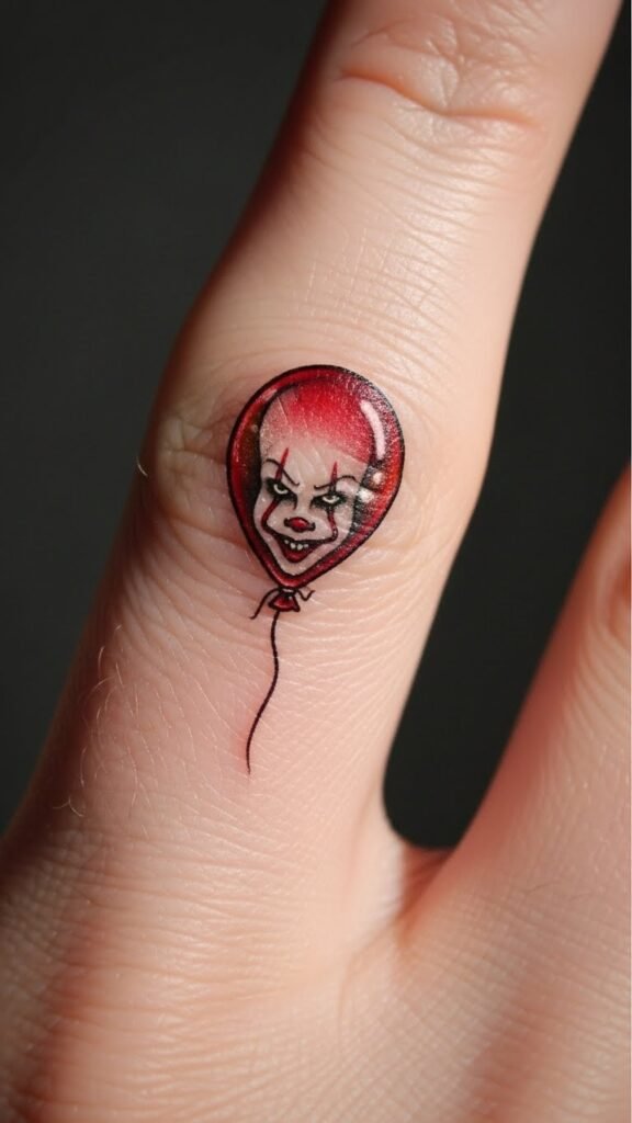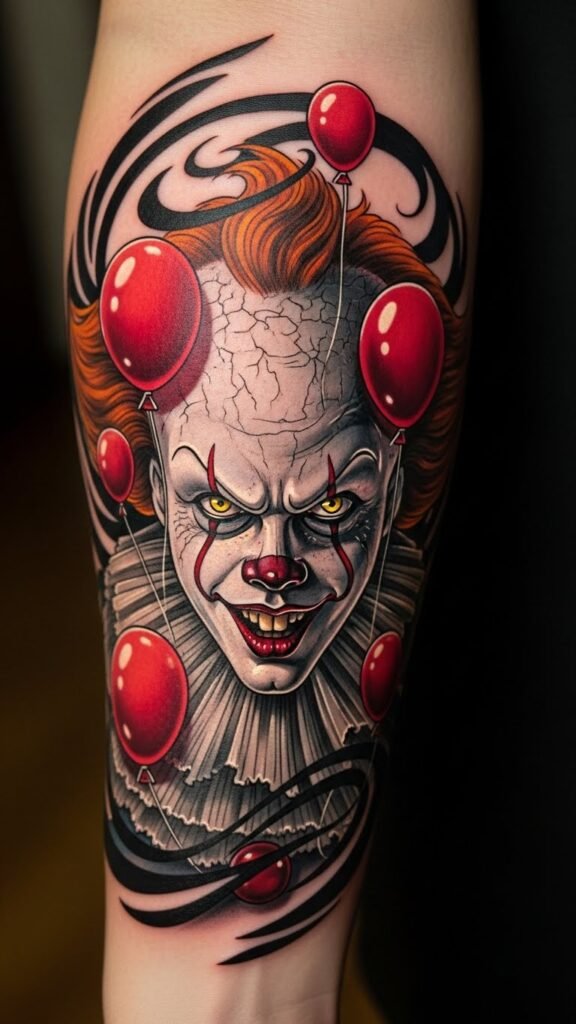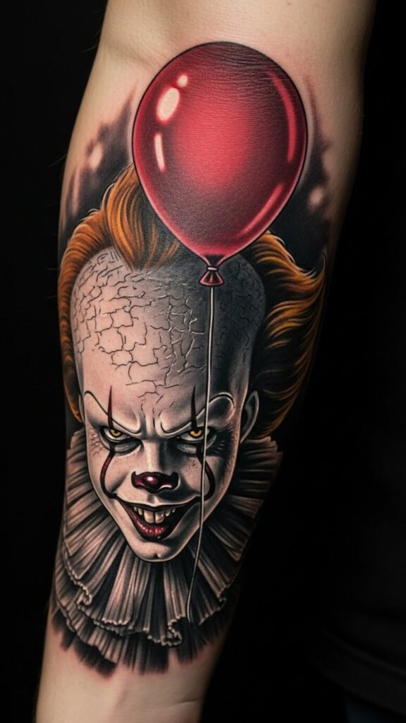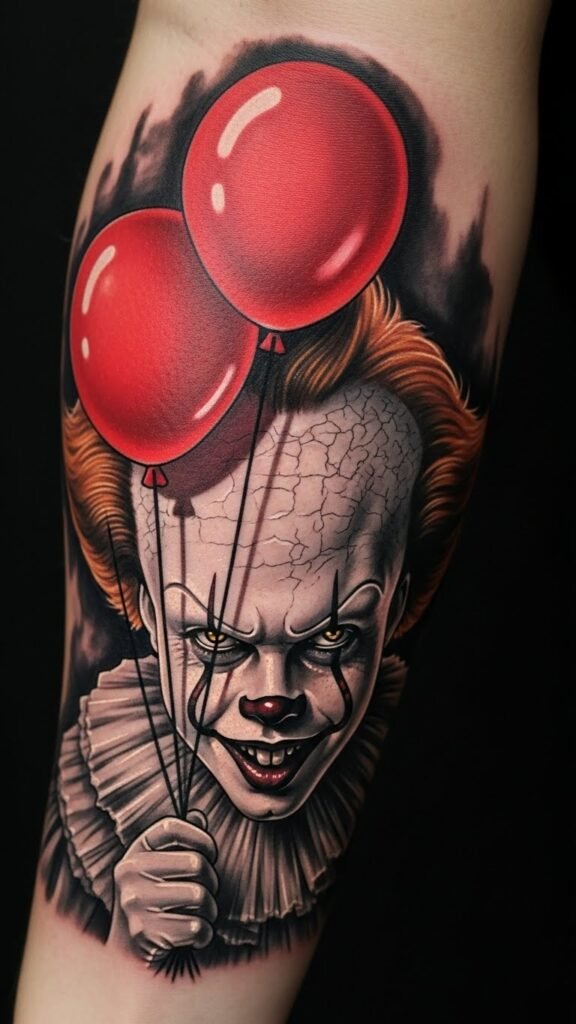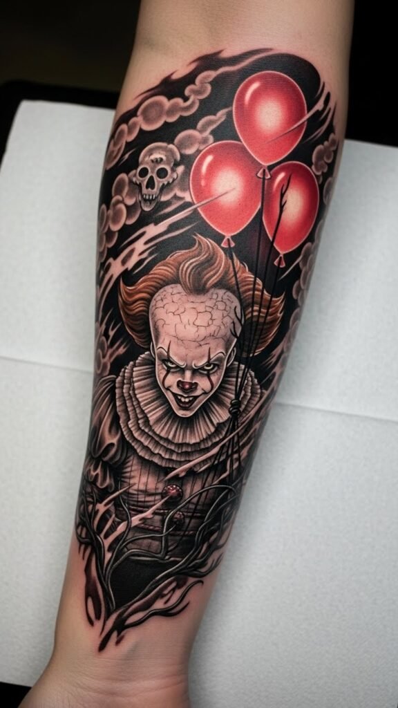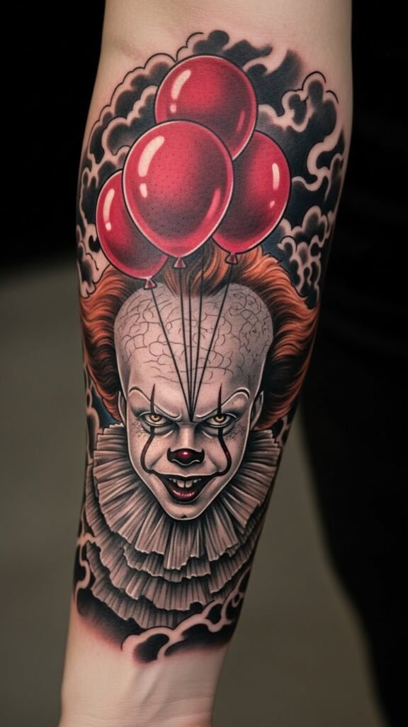 The placement on the forearm allows for visibility and expression, inviting curiosity and conversation. The floating red balloons symbolize the deceptive allure of fear, reminding the wearer of personal struggles and the importance of confronting one’s nightmares, all while showcasing a striking piece of artistry that resonates with those familiar with the character’s haunting legacy.