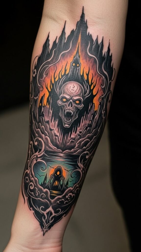 Placed on the forearm, it serves as a bold statement piece that showcases the wearer’s passion for the macabre, while also engaging with the art of tattoo culture.