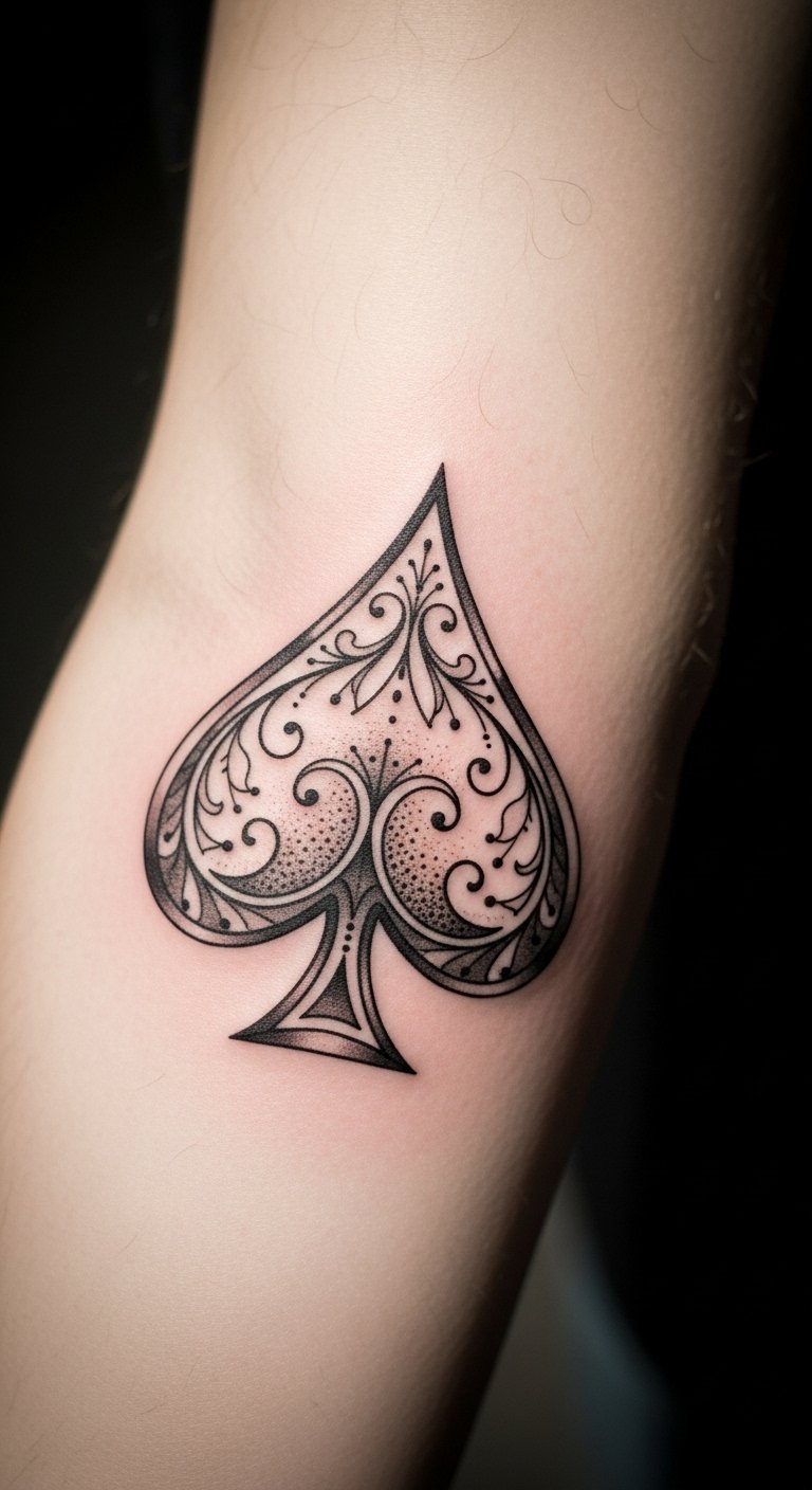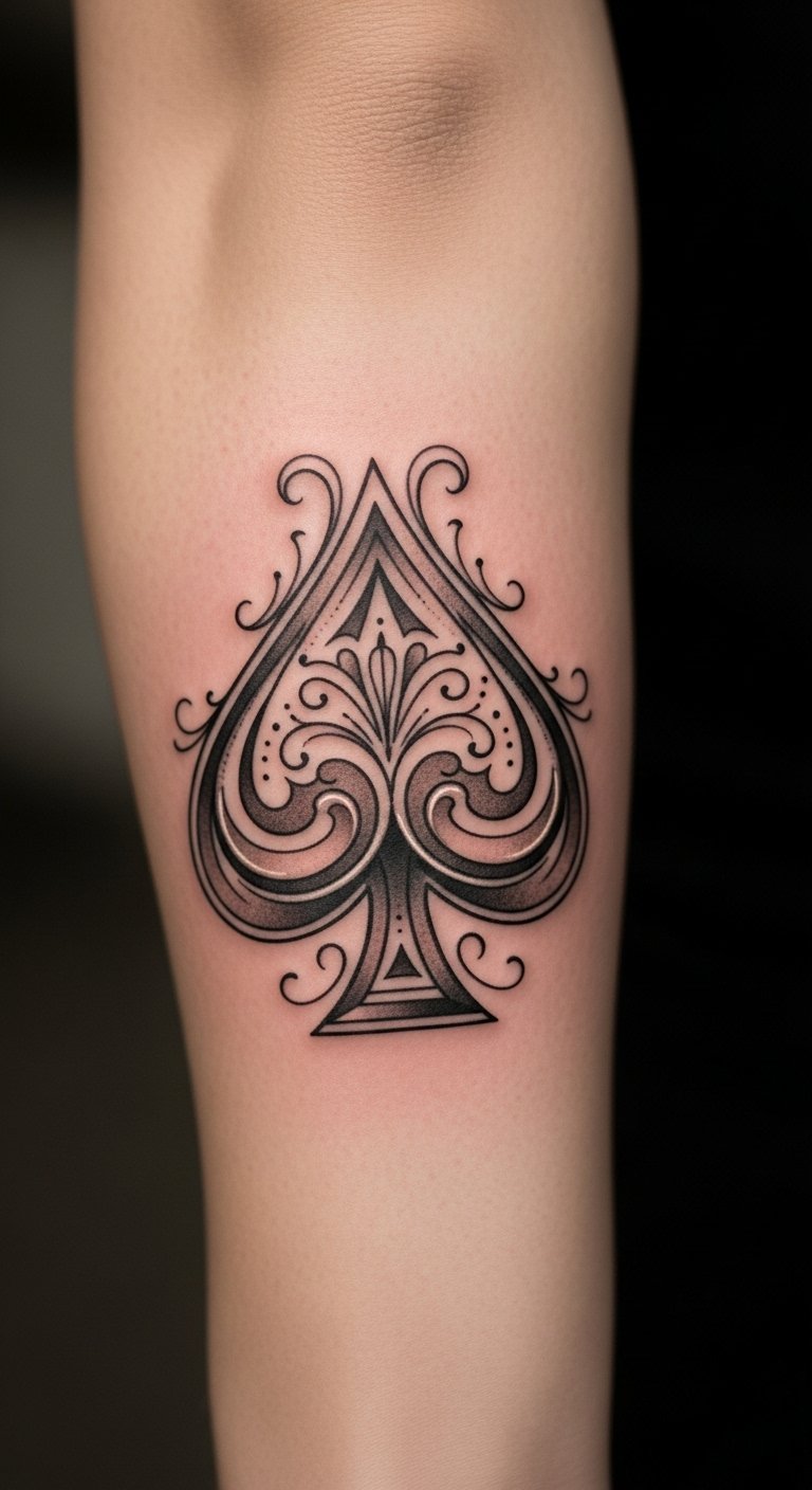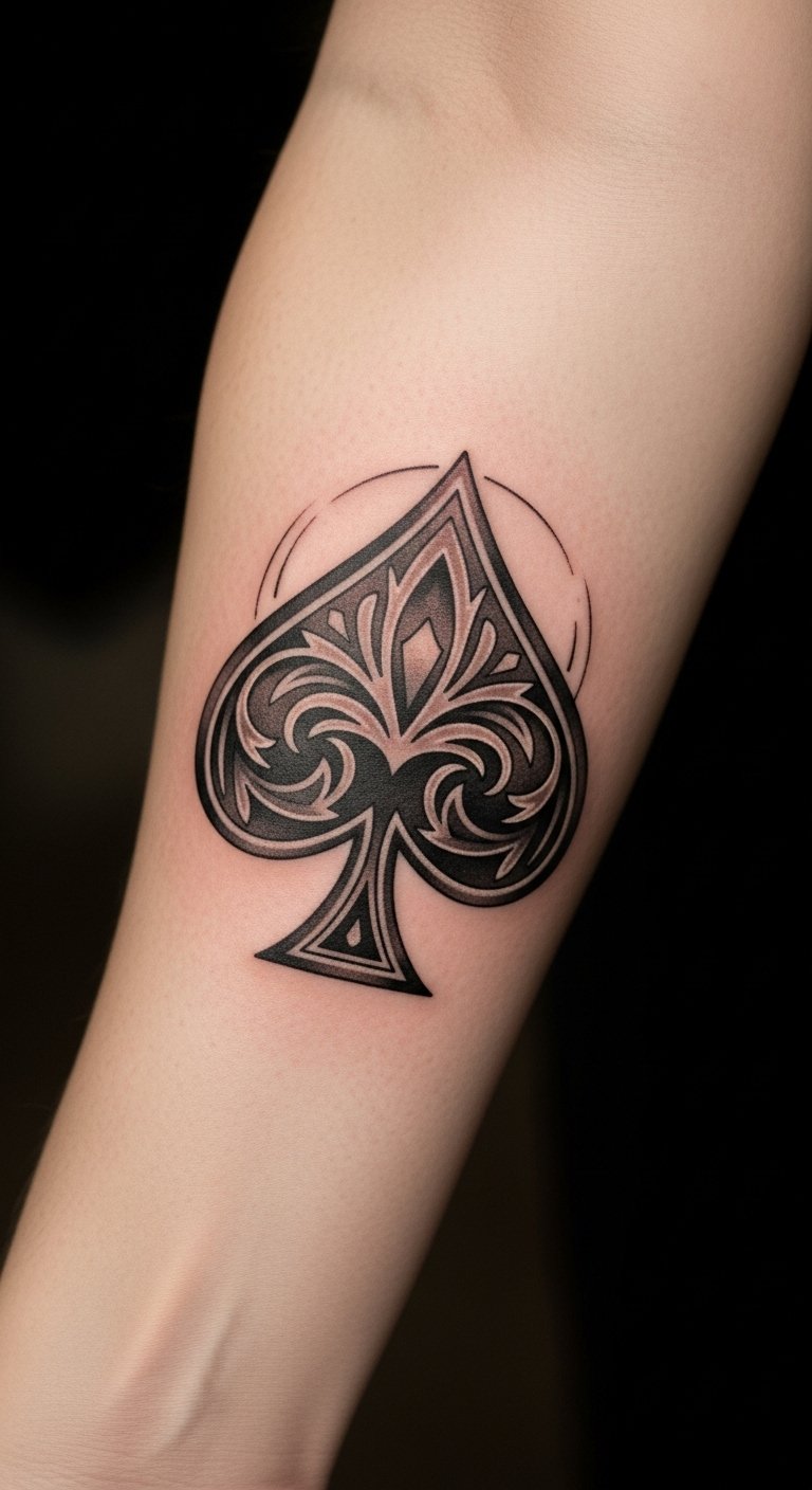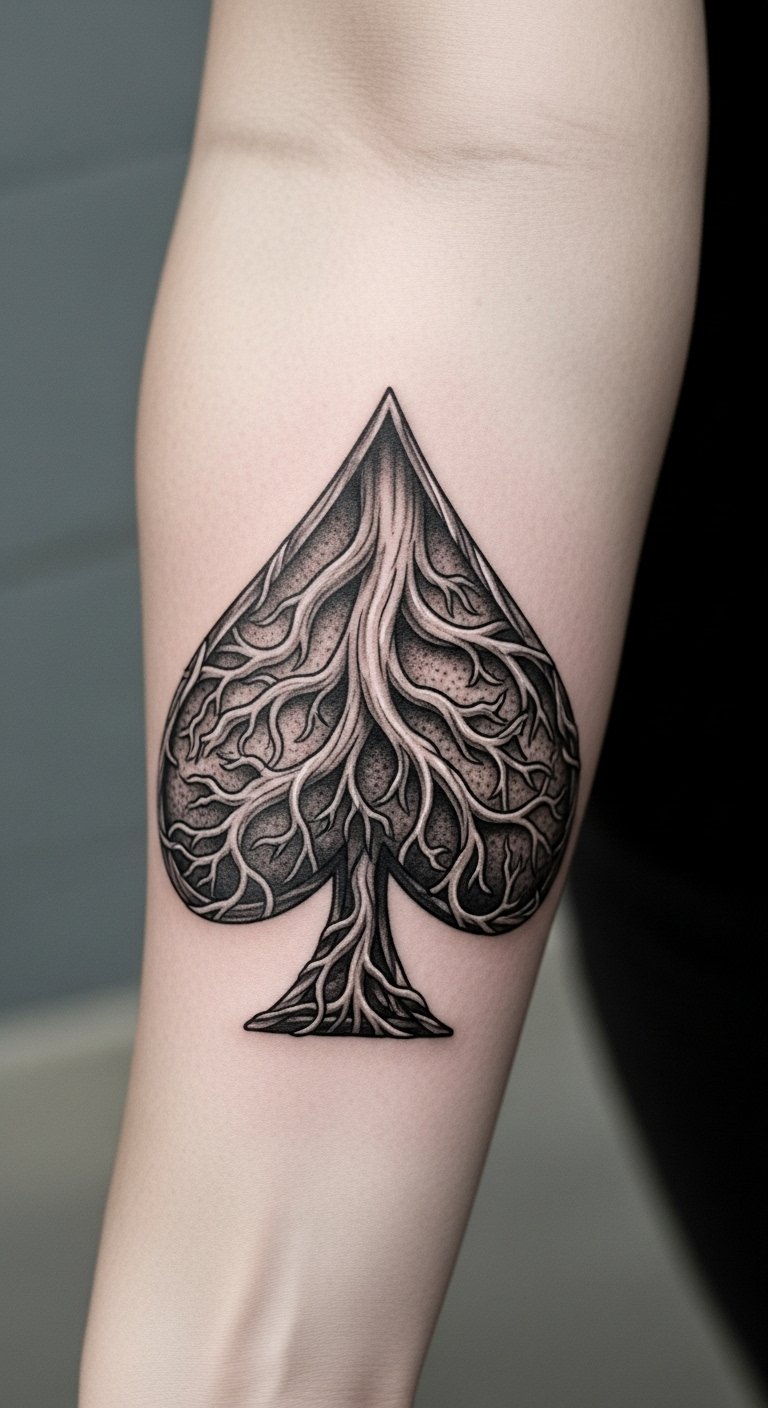 This spade tattoo, situated on the forearm, acts as a constant reminder of one’s inner strength and independence. The placement allows for visibility, making it a personal emblem of resilience that can be easily shown or concealed.