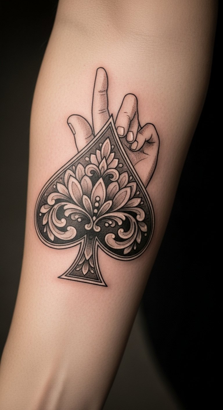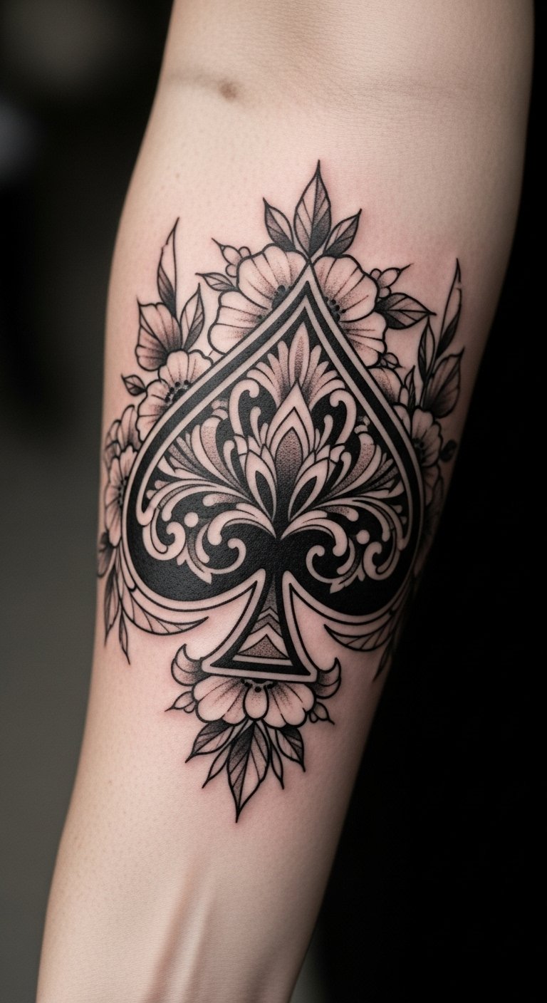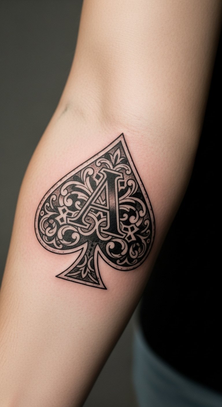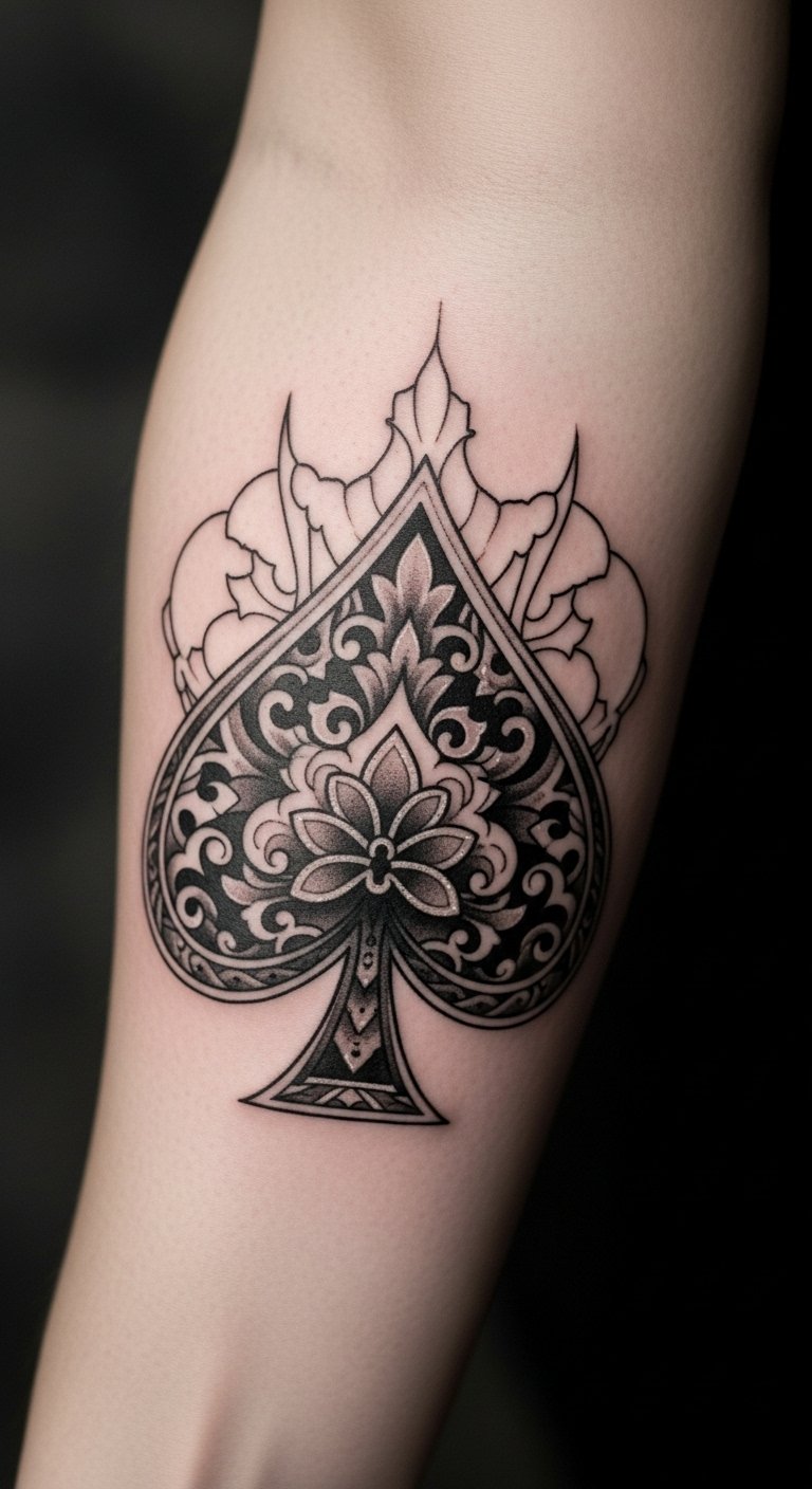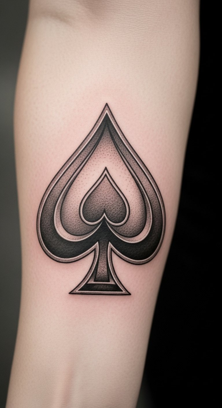 This spade tattoo, situated on the forearm, acts as a constant reminder of one’s inner strength and independence. The placement allows for visibility, making it a personal emblem of resilience that can be easily shown or concealed.