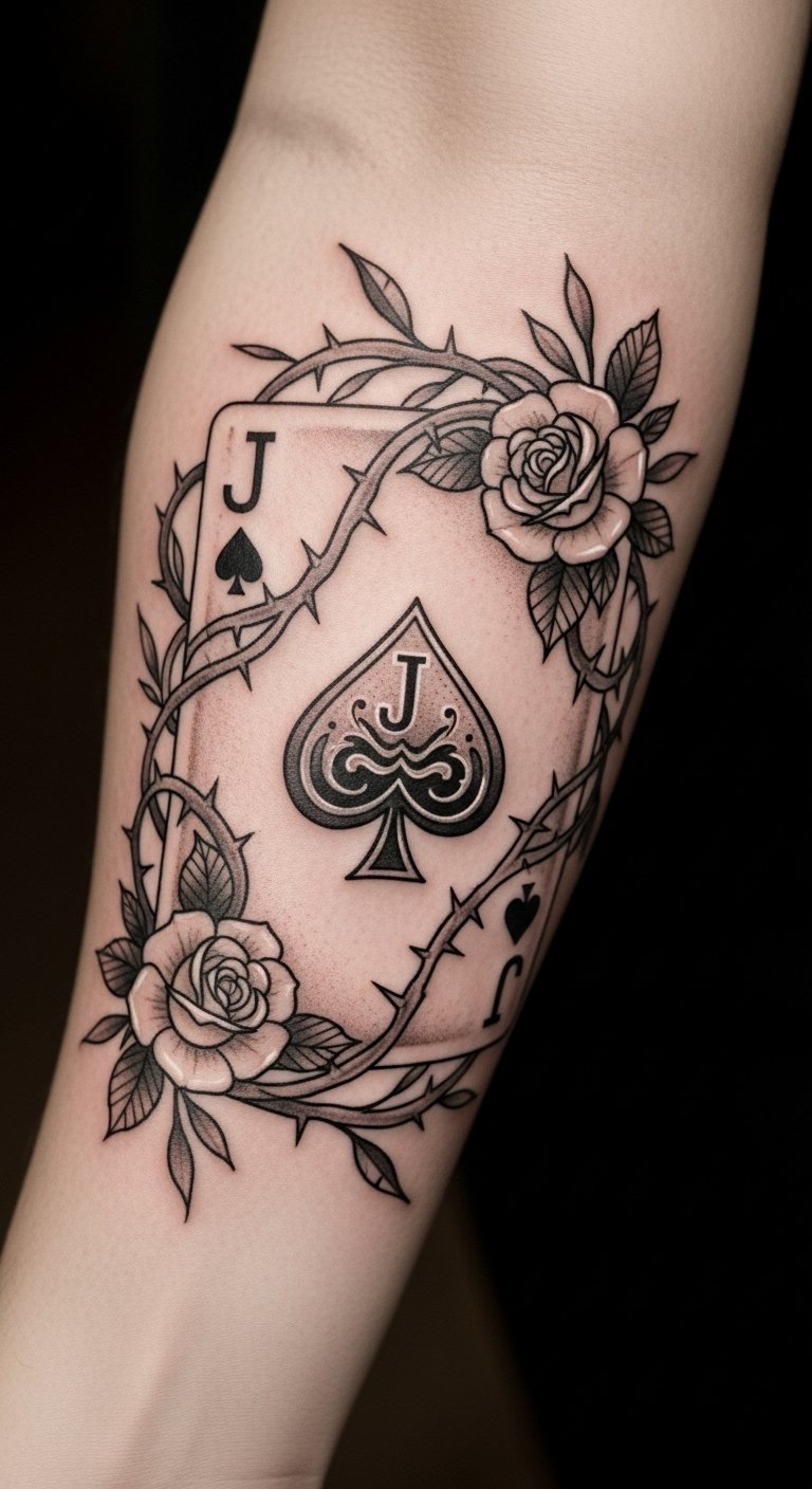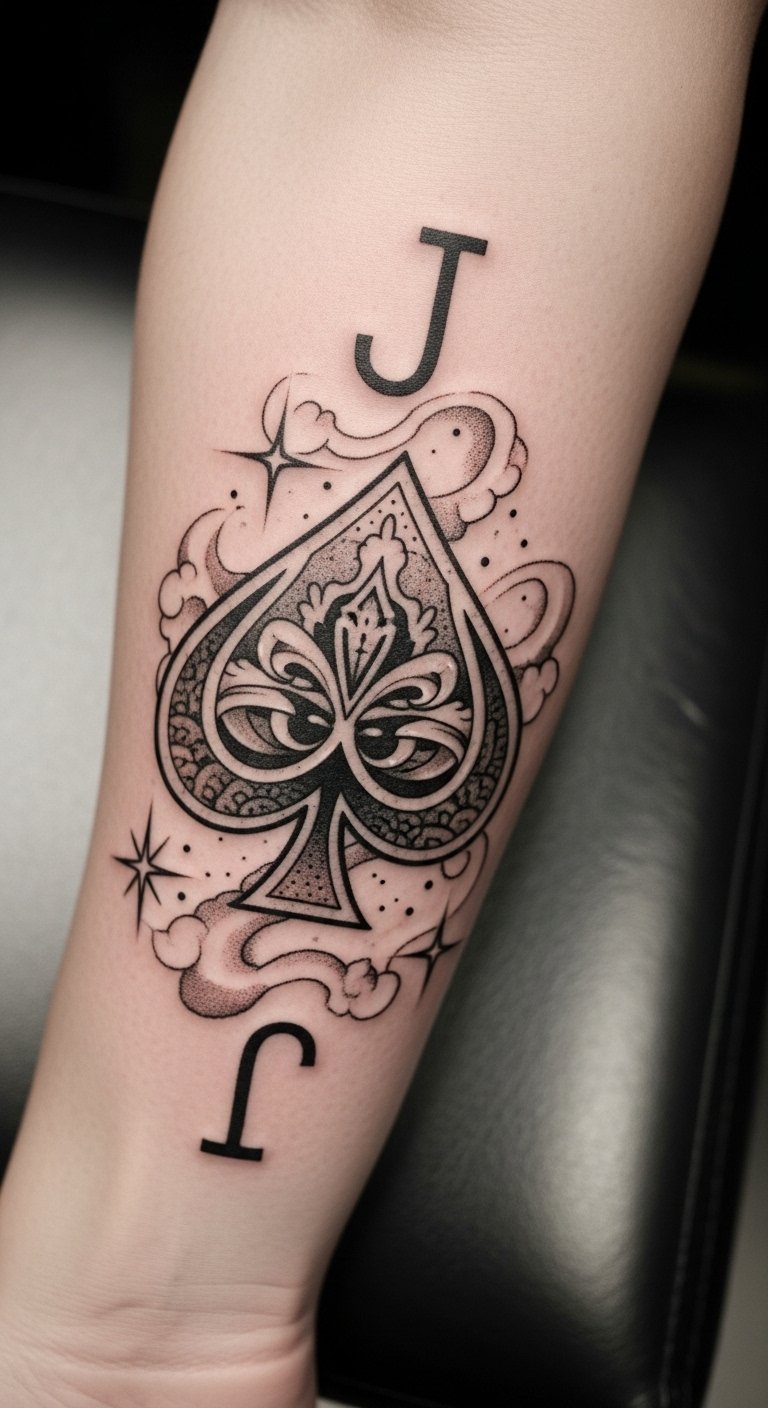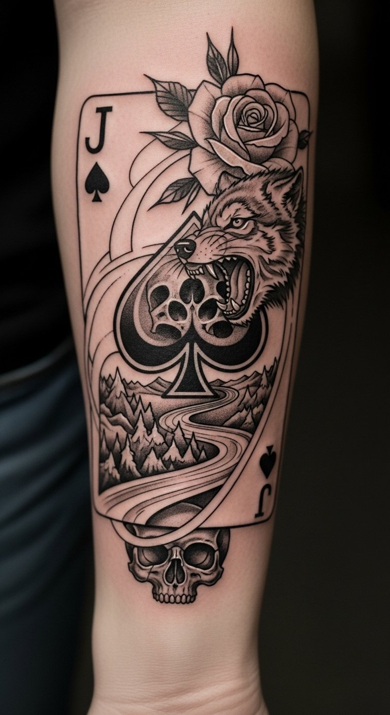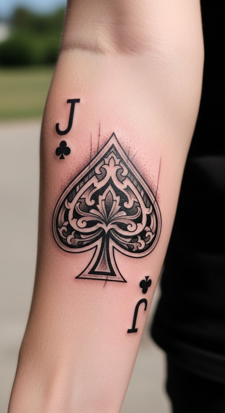 The Jack of Spades tattoo on the forearm serves as a powerful emblem of faithful service and free will. Positioned in a visible area, it invites admiration and sparks conversation, encouraging others to reflect on their own beliefs and choices.
