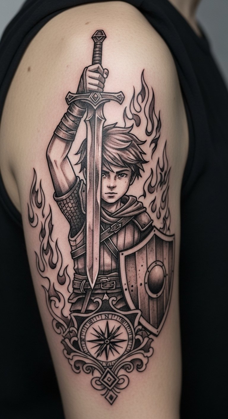 This tattoo design embodies the essence of the young warrior archetype, representing strategic thinking, courage, and the relentless pursuit of personal growth.