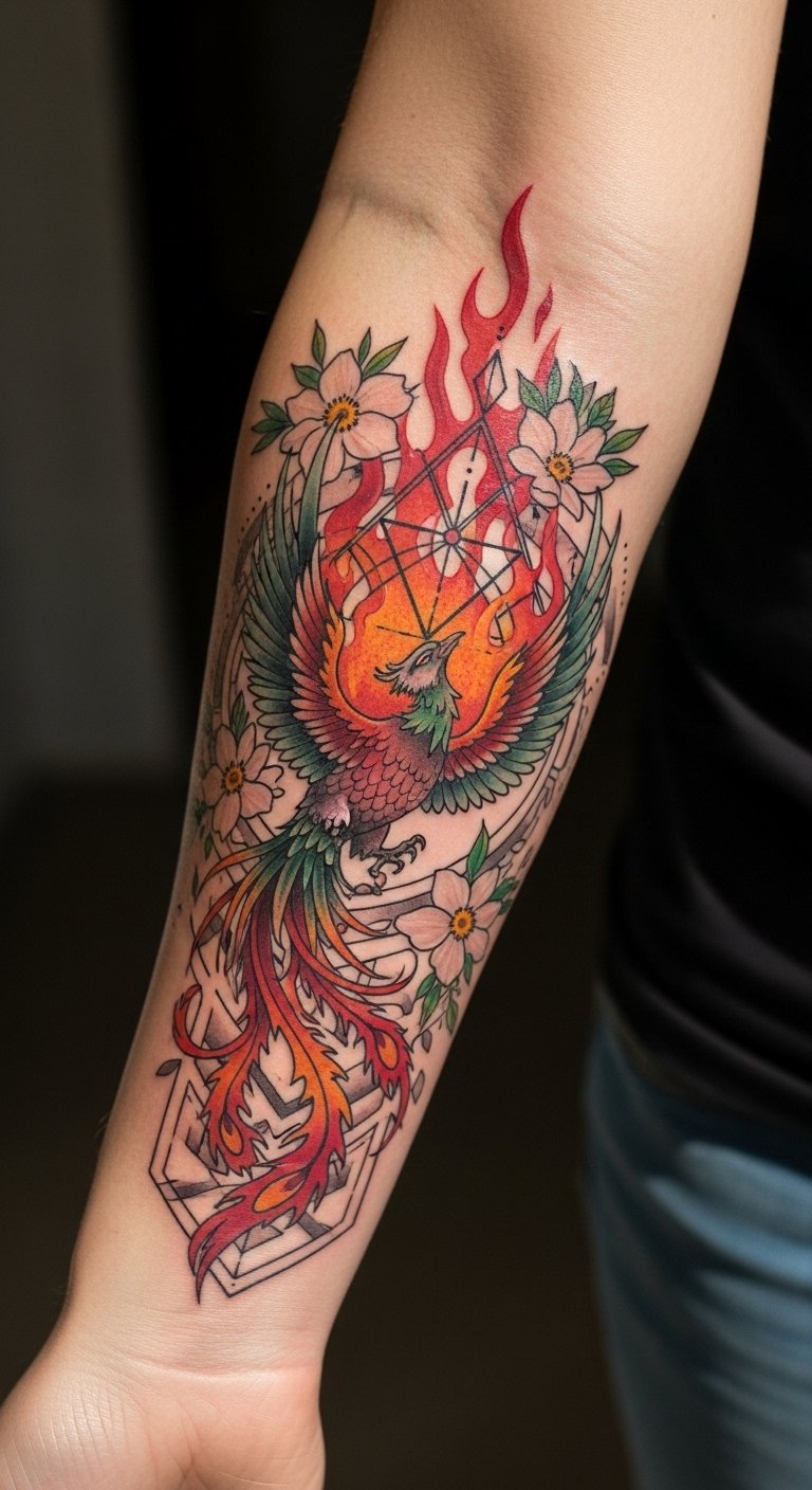 This tattoo symbolizes rebirth and resilience, echoing the journey of overcoming challenges and embracing transformation. The phoenix represents strength and renewal, while the flowers signify beauty and growth amidst adversity.