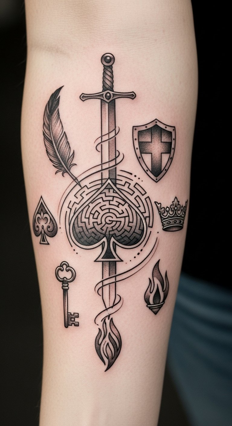 The spade tattoo on the forearm serves as a powerful emblem of strength and personal journey. Its placement allows for visibility, inviting conversations about its mystical associations and the transformative experiences it represents.