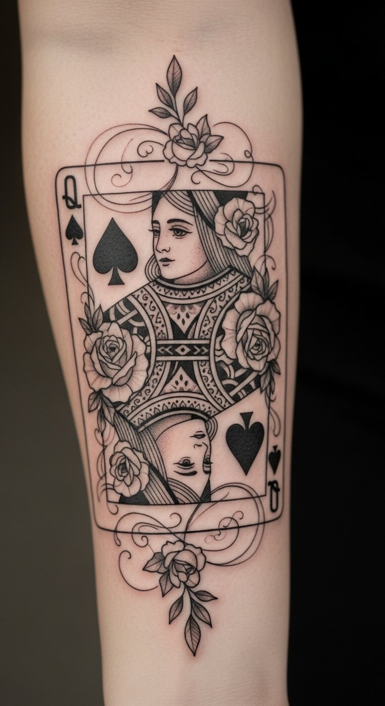 This tattoo, placed prominently on the forearm, embodies themes of sexuality and power, inviting intrigue and conversation. The Queen of Spades symbolizes personal freedom and strength, making it a bold statement piece for those who wear it.