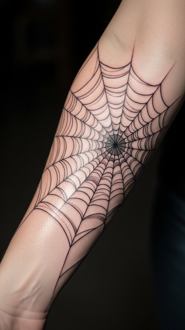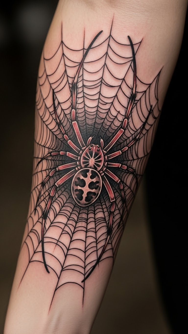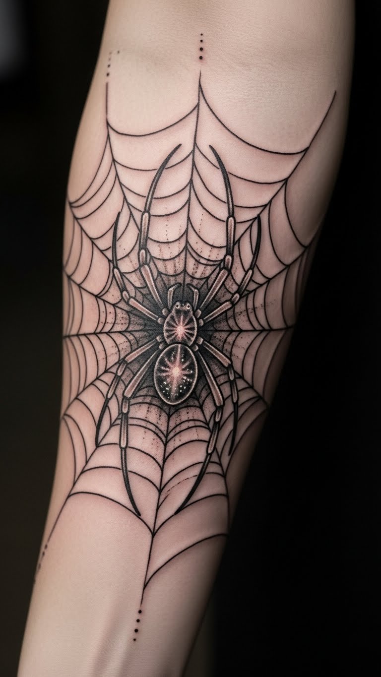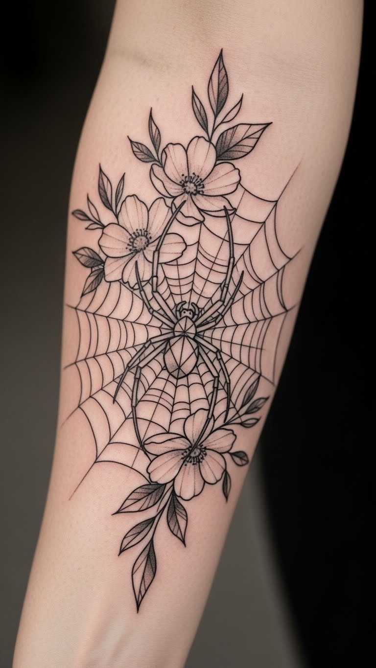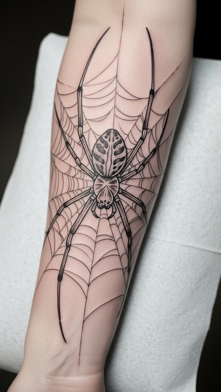 Placed on the inner forearm, it serves as a constant reminder of the wearer’s unique individuality and strength. The intricate web intertwines with the skin, creating a sense of connection between the body and the tattoo, allowing for a personal narrative that resonates deeply.