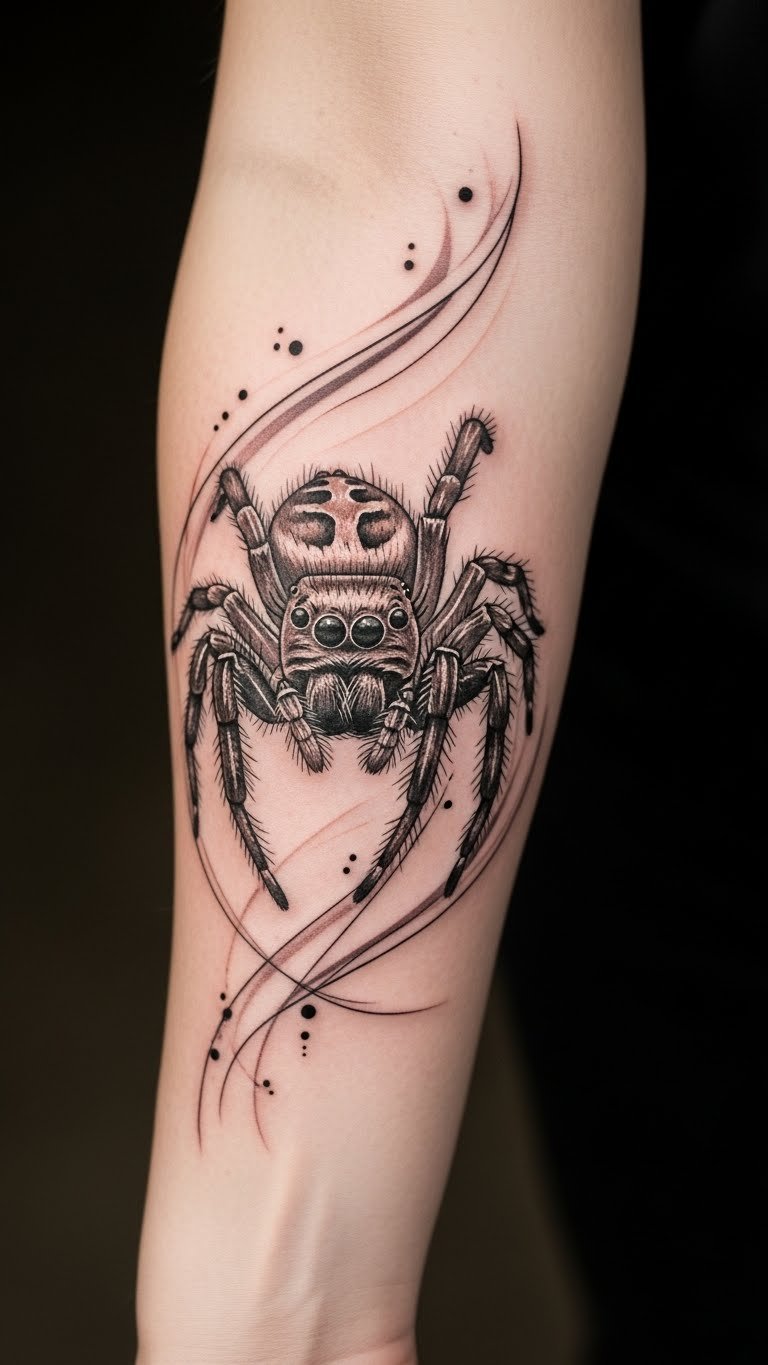 This jumping spider tattoo on the forearm serves as a powerful symbol of resilience and creativity.
