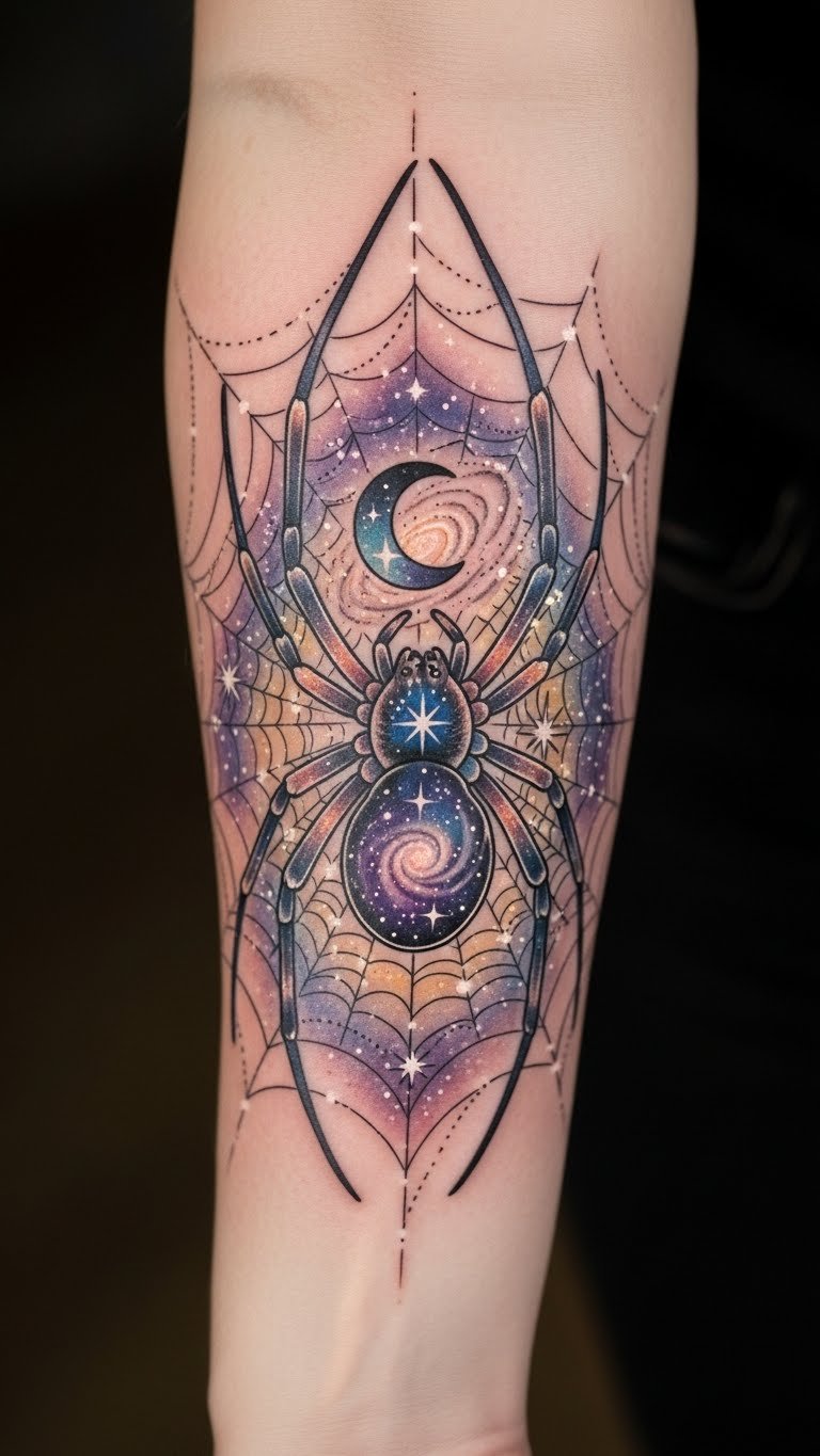Embracing the universe’s mysteries, this celestial spider tattoo serves as a powerful symbol of creativity and cosmic connection.