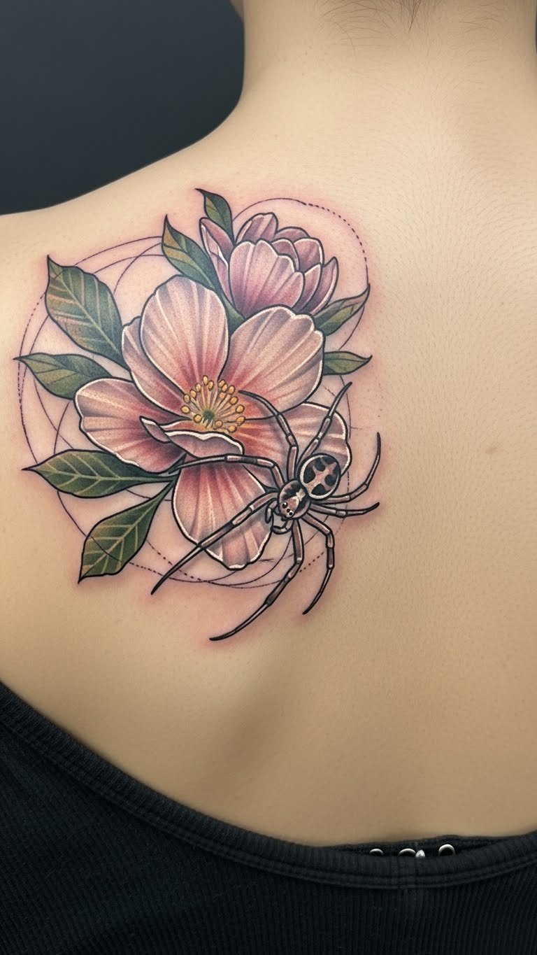 Placed on the upper back, it serves as a canvas that embodies both personal strength and artistic expression. The flower signifies growth and resilience, while the spider reflects creativity and patience, making it a meaningful statement piece that resonates deeply with the wearer.