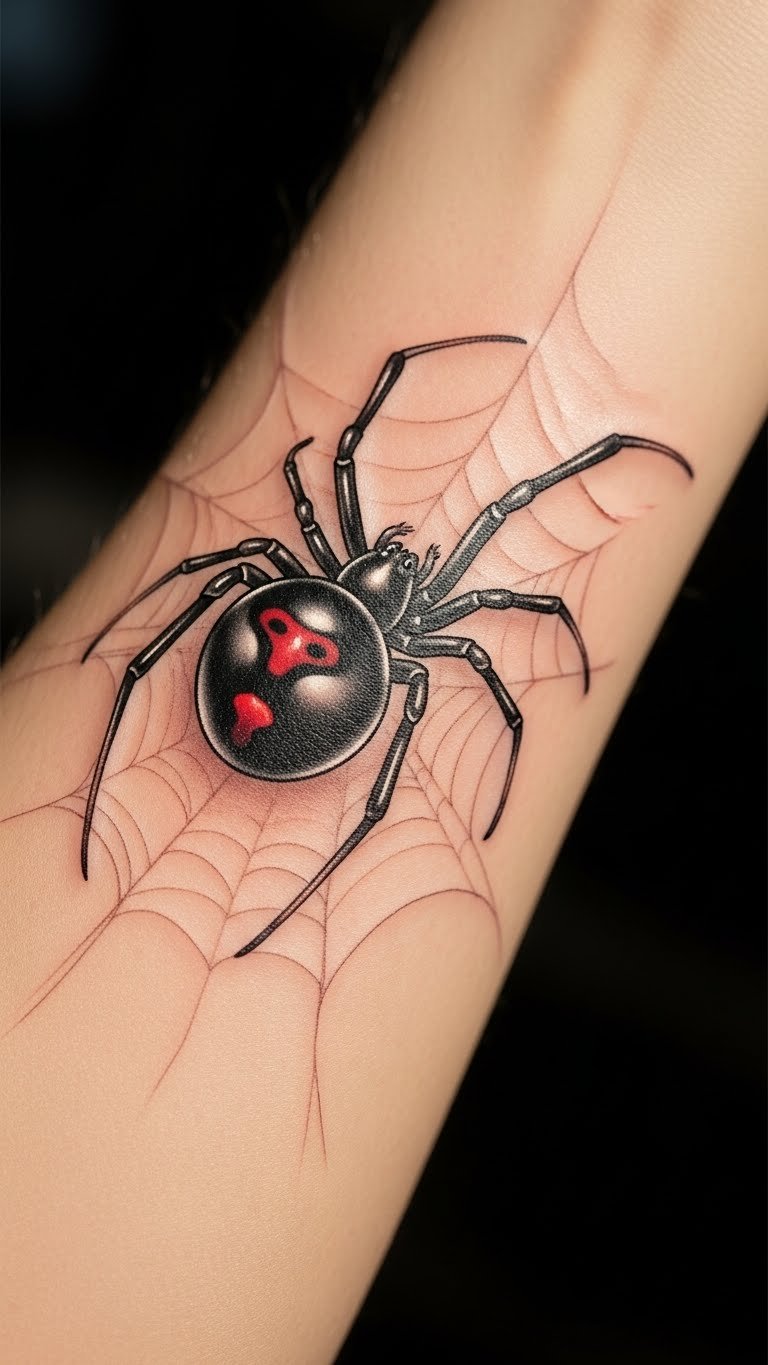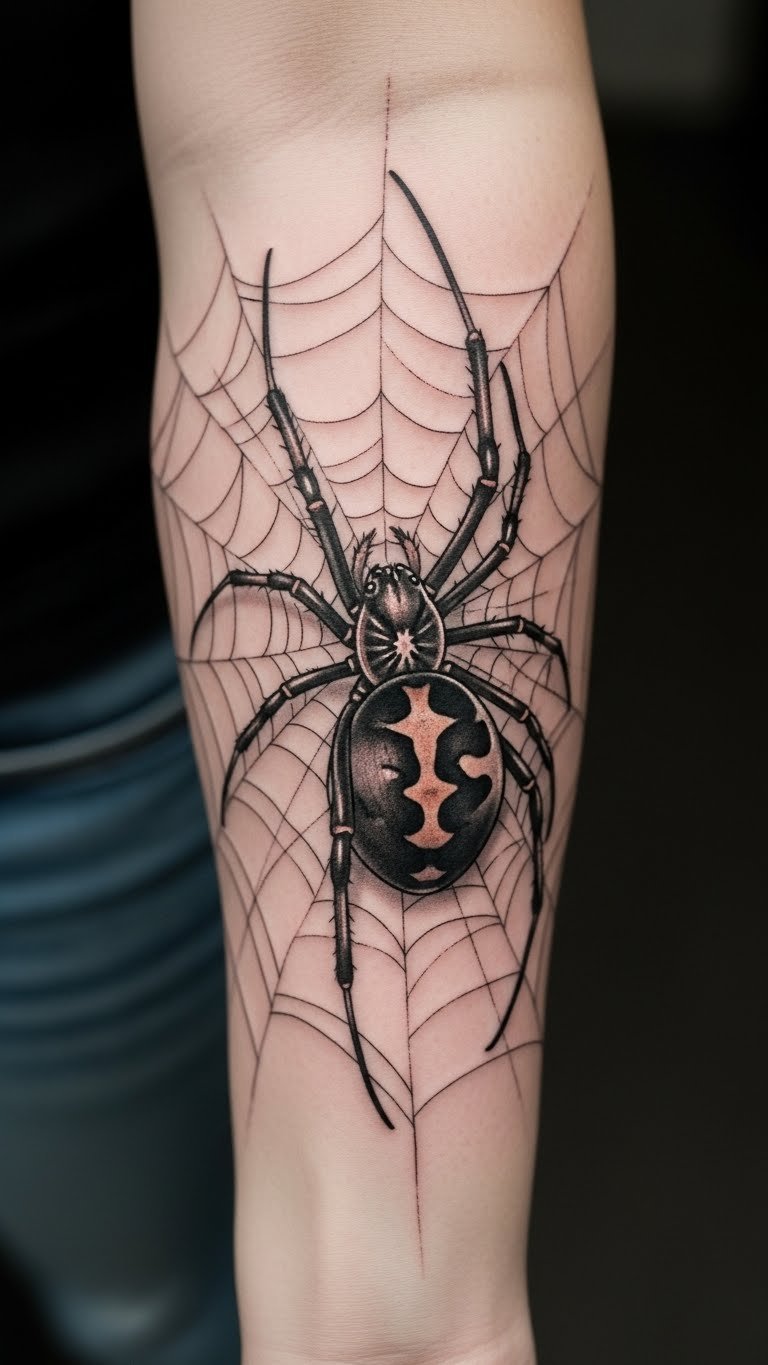 This black widow spider tattoo, positioned on the forearm, serves as a bold statement of power and resilience.
