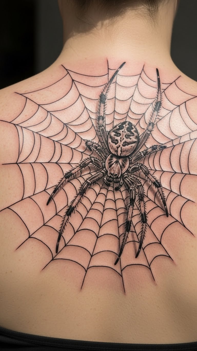 The spider symbolizes fear and transformation, embodying the duality of beauty and horror. Positioned on the shoulder blade, it serves as a bold statement piece, visible yet personal, reflecting the wearer’s fearless spirit and appreciation for the macabre.