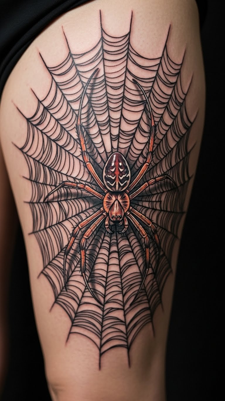 This thigh spider tattoo symbolizes strength and resilience, embodying the wearer’s journey through life’s challenges. The spider, often seen as a symbol of creativity and patience, weaves its web as a representation of personal growth and the intricate paths we navigate.