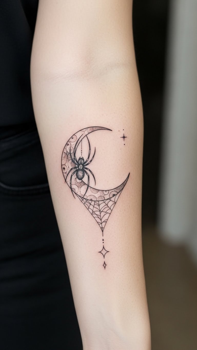 This tattoo symbolizes the connection between the feminine energy represented by the moon and the creative, transformative qualities of the spider.