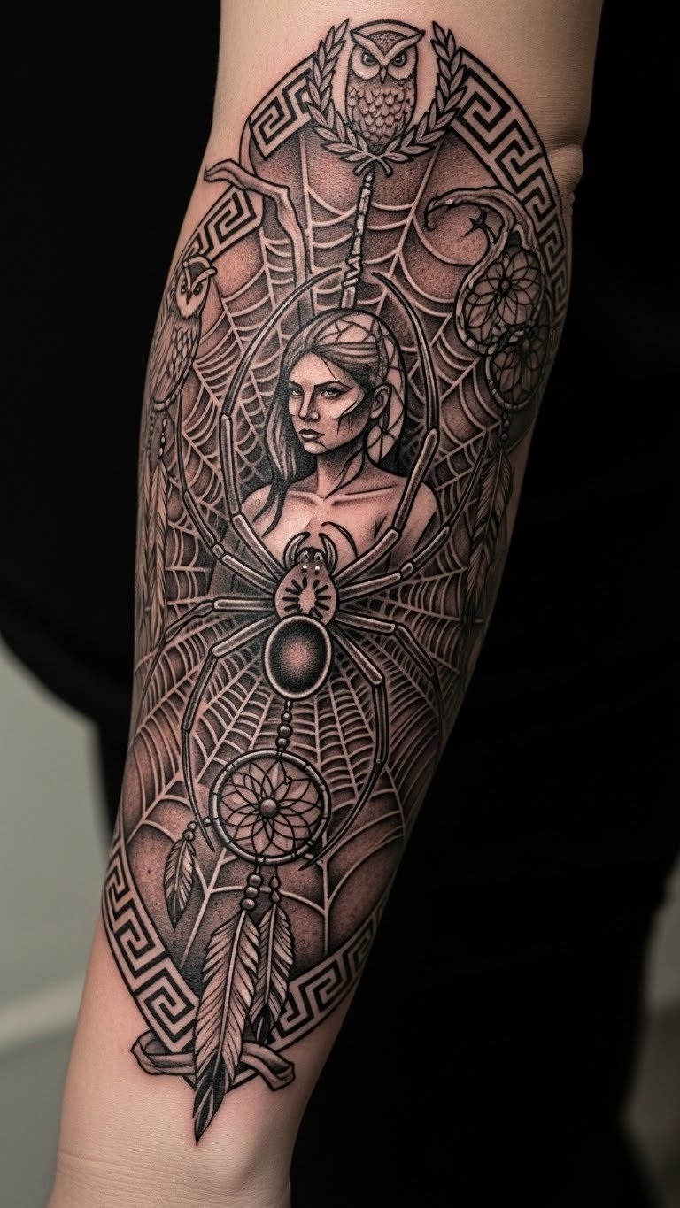 This tattoo serves as a powerful emblem of unity between different cultural narratives, where the spider symbolizes protection and empowerment.