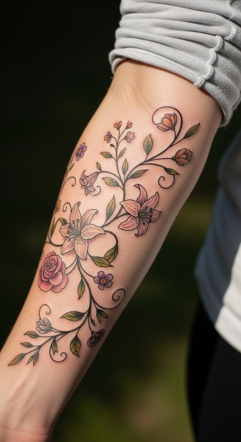 This tattoo symbolizes growth and resilience, with the floral elements representing beauty in fragility.