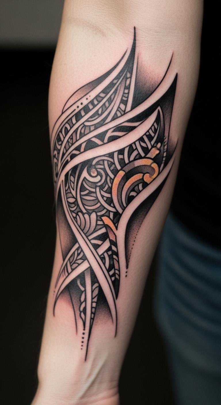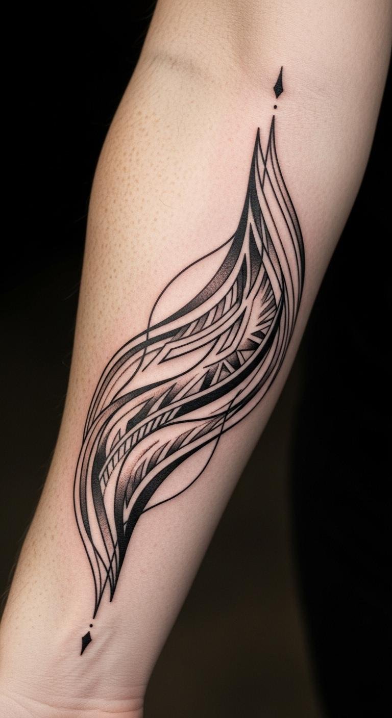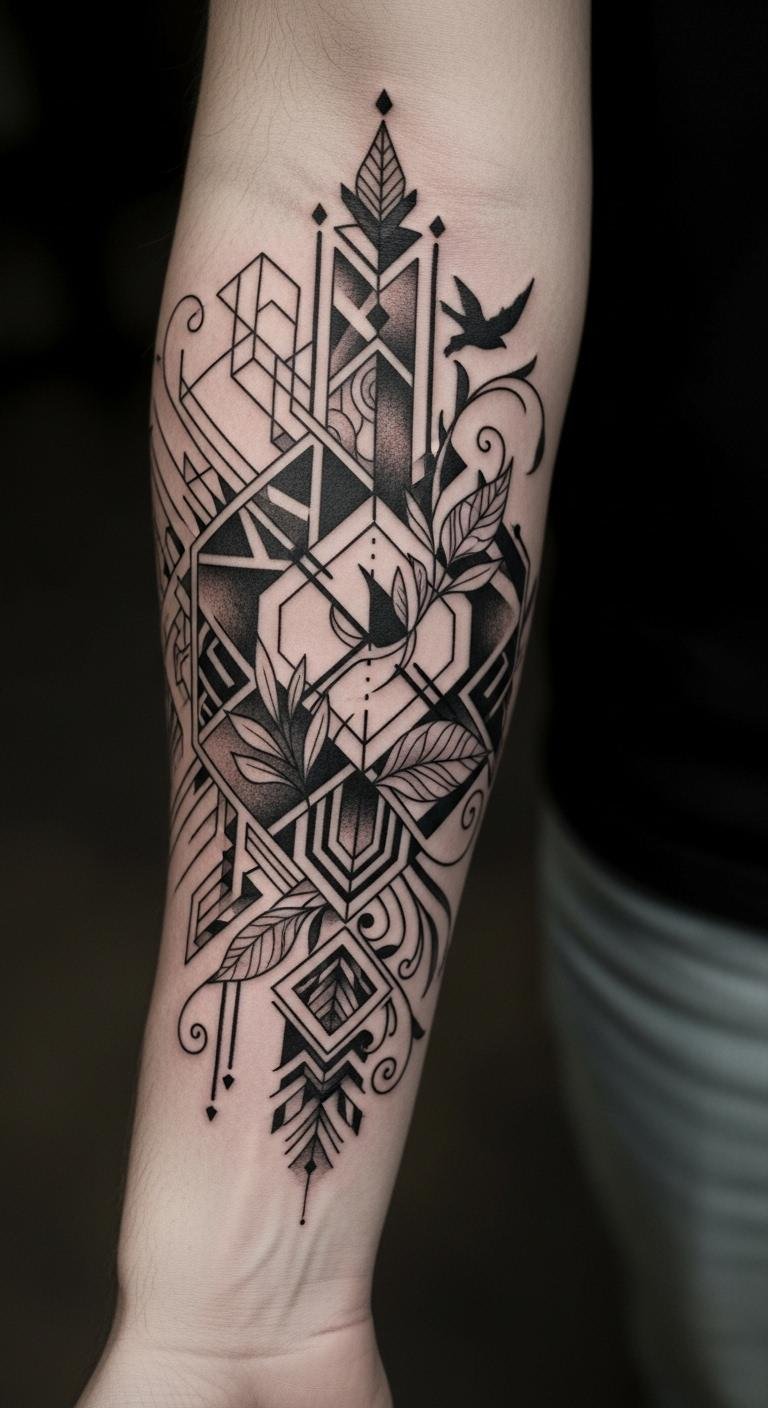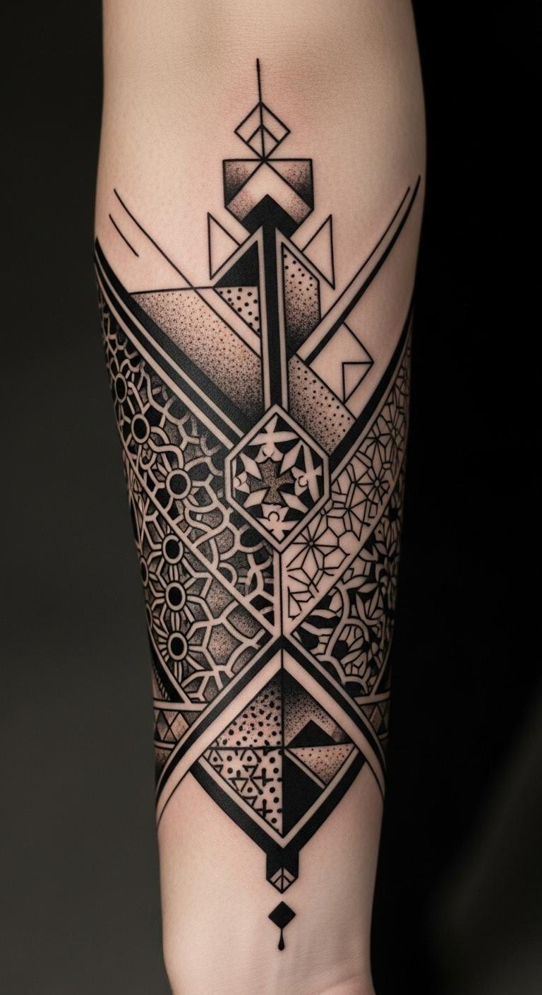 This tattoo embodies the essence of bold blackwork styles, making a striking statement on the forearm. The sharp geometric shapes symbolize strength and resilience, while the intricate patterns represent the complexity of one’s journey.
